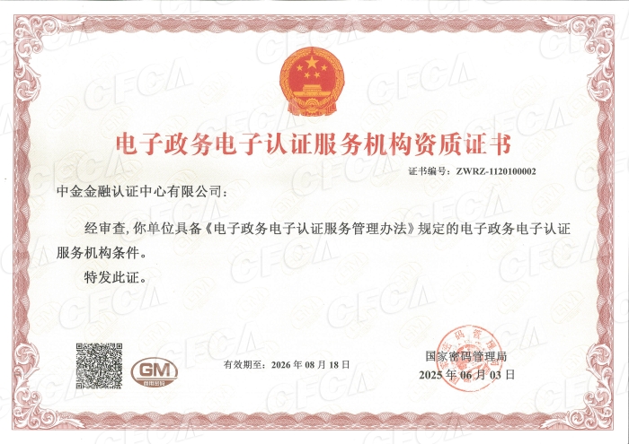 近日,中金金融认证中心(CFCA)通过国家密码管理局资质审查,获颁新版《电子政务电子认证服务机构资质证书》。