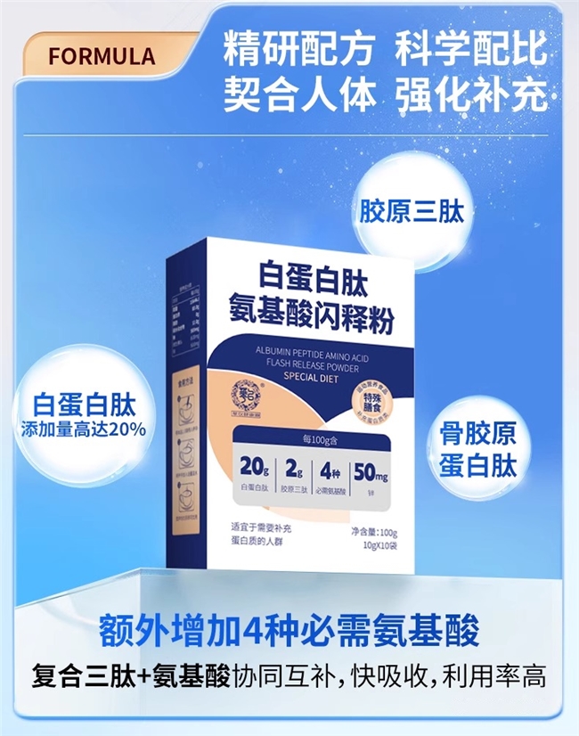 此外,其采用骨胶原蛋白肽与白蛋白复配的黄金组合,骨胶原蛋白肽为伤口愈合提供结构支撑,促进成纤维细胞增殖,加速皮肤及黏膜修复;搭配L-苏氨酸、L-丙氨酸等4种人体必需氨基酸,精准补充术后流失的营养素,为免疫细胞和新生组织提供构建基石。更特别添加灵芝提取物,其多糖成分能调节术后炎症反应,降低感染风险,同时提升白蛋白的吸收效率。三者协同作用,形成"修复-营养-免疫"的闭环,尤其适合术后蛋白质需求激增、消化功能减弱的人群,实现更高效、更安全的康复支持。