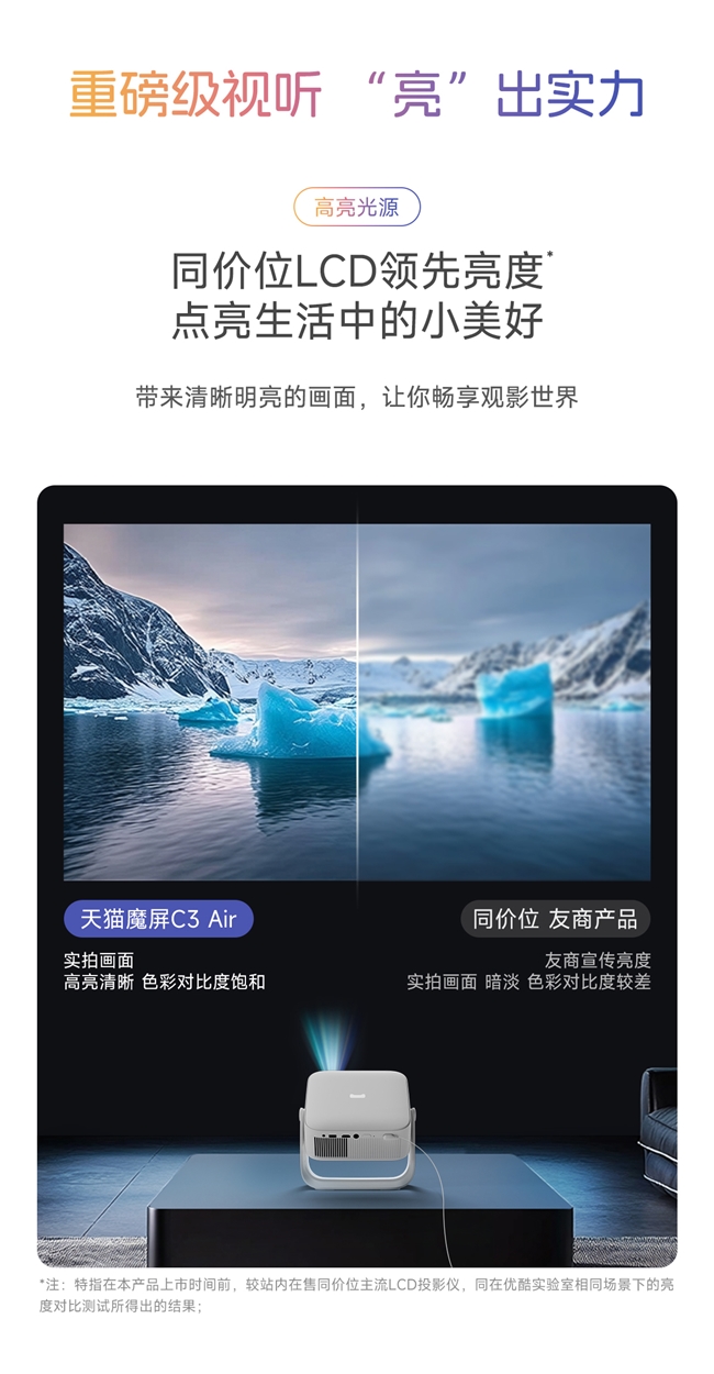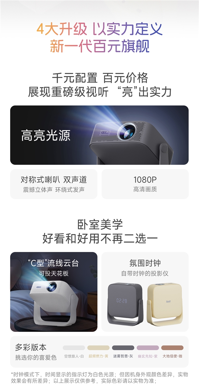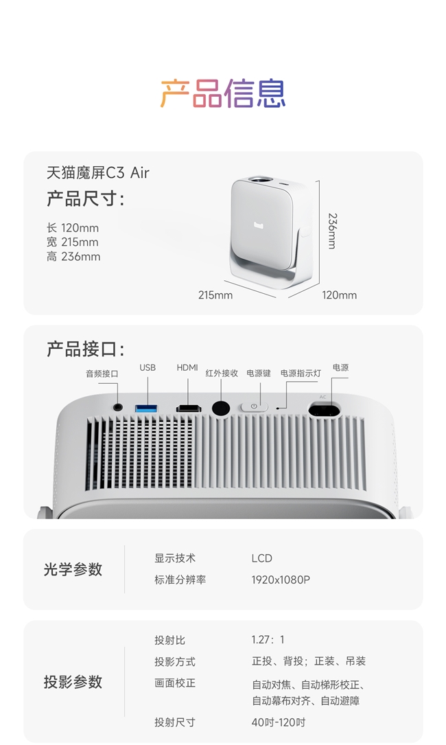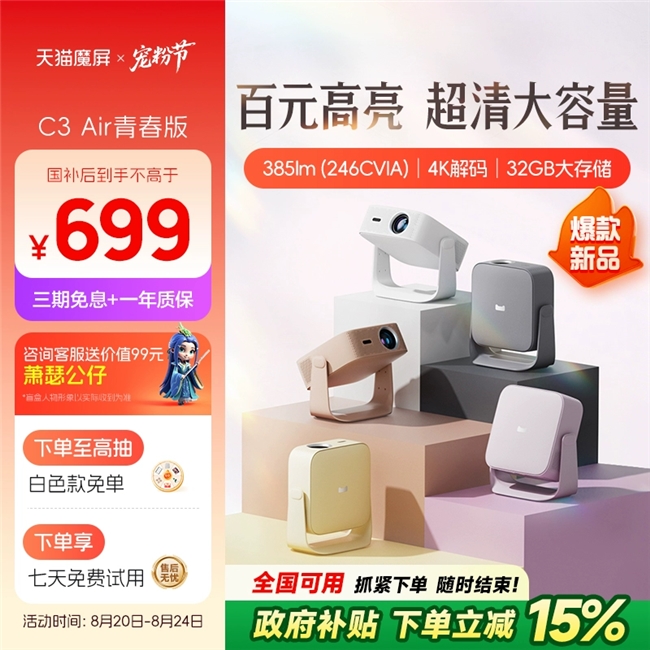 在追求视听享受的道路上,投影仪正逐渐成为众多消费者的心头好,尤其是对于学生党而言,一款性价比高的投影仪既能满足娱乐需求,又不会给钱包带来太大压力。天猫魔屏 C3 Air 投影仪凭借其出色的配置和丰富的功能,成为了学生党的必要选择,堪称性价比新标杆。 一、外观设计:小巧精致,多彩时尚 天猫魔屏 C3 Air 的外观设计十分讨喜,整体造型小巧精致,尺寸为 120×215×236mm,重量在 1-1.99kg 之间,方便学生党在宿舍、家中等不同场景轻松移动。它提供了空想旅人(白)、超频燃力(黄)、迷雾哲思(灰)、幽玄先知(紫)、大地信使(咖)等多种配色,满足不同学生的个性化审美需求,为单调的生活空间增添一抹亮色。同时,其简约的设计风格能够与各种装修风格相融合,无论是现代简约风还是温馨田园风的宿舍或房间,它都能完美适配。 二、投影效果:高清高亮,沉浸体验 ● 高分辨率:在分辨率方面,天猫魔屏 C3 Air 达到了真 1080P(1920×1080dpi),能够清晰地呈现出画面的每一个细节。无论是观看高清电影、电视剧,还是展示学习资料中的图片、文档,都能让你感受到细腻的画质。与同价位产品相比,很多只能达到 720P 甚至更低的分辨率,在显示文字边缘时会出现模糊现象,而 C3 Air 的 1080P 分辨率则能让文字清晰锐利,图片色彩鲜艳、过渡自然,为学生们带来了远超同价位产品的视觉体验。 ● 亮度表现:对于学生党在宿舍或一般光线条件下的使用场景来说,、足够清晰地投射出画面。在晚上关灯后,其投影效果尤为出色,能够营造出电影院般的沉浸感。即使在白天,只要拉上窗帘,也能获得不错的观看效果。相比一些低亮度的投影仪,在光线稍强的环境下就会出现画面发白、看不清的情况,C3 Air 的亮度表现无疑更具优势。而且,它支持投射 40-120 英寸的画面范围,投射比为 1.27:1,能够满足不同空间大小的需求。无论是在狭小的宿舍床铺前投射出 40 英寸的小屏幕,还是在客厅等较大空间投射出 120 英寸的大屏,都能轻松实现,让学生们仿佛置身于私人影院之中。 ● 色彩还原:该投影仪在色彩还原度上也有着不错的表现,能够准确地呈现出丰富而鲜艳的色彩。通过先进的色彩校准技术,它能够让电影、游戏中的场景更加生动逼真,人物肤色自然,景色绚丽多彩。无论是观看色彩斑斓的动漫作品,还是紧张刺激的动作大片,都能为学生们带来一场视觉盛宴。 三、功能特性:智能便捷,贴心实用 ● 自动校正功能:学生党在使用投影仪时,经常会遇到需要频繁调整投影角度和画面的情况。天猫魔屏 C3 Air 配备了自动梯形校正功能,无论你将投影仪放置在什么角度,它都能快速自动调整画面为方正的矩形,无需手动繁琐调节。同时,它还支持自动对焦功能,开机瞬间就能将画面清晰地呈现出来,大大节省了使用时间。此外,部分型号还具备自动幕布对齐和自动避障功能,当检测到投影区域内有障碍物时,会自动调整画面避开,并且能够自动与幕布边缘对齐,为用户带来了极致便捷的使用体验。 ● 智能系统与多屏互动:它搭载了酷喵 TV OS 智能系统,操作界面简洁明了,易于上手。内置丰富的影视资源,涵盖了电影、电视剧、综艺、动漫等各类内容,学生们可以通过搜索、分类导航等方式轻松找到自己喜欢的节目。同时,该投影仪支持苹果 / 安卓 / 华为 / Cast+/Windows 等多种设备的多屏互动功能,学生们可以将手机、平板、电脑上的内容无线投屏到大屏幕上,无论是分享学习资料、展示照片,还是玩手游、看网课,都变得更加方便。比如,在学习过程中,学生可以将电脑上的课件投屏到投影仪上,通过大屏幕更清晰地展示给同学或老师,方便小组讨论和学习交流;在休闲娱乐时,将手机上的游戏投屏到大屏幕上,获得更震撼的游戏视觉体验。 ● 蓝牙音箱模式:除了作为投影仪使用,天猫魔屏 C3 Air 还具备音乐空间(蓝牙音箱)工作模式。当你不想投影画面,只想听音乐时,只需将其切换到蓝牙音箱模式,它就能变身成为一个高品质的蓝牙音箱。通过蓝牙连接手机、平板等设备,播放你喜欢的音乐。其内置的双声道立体环绕音效扬声器,能够带来出色的音质表现,让你在享受音乐时仿佛置身于音乐会现场。无论是在宿舍休息时听一首舒缓的歌曲放松身心,还是在聚会时播放动感的音乐活跃气氛,它都能完美胜任。 ● 接口丰富:在接口方面,C3 Air 配备了 HDMI 接口 ×1、音频接口 ×1、USB×1 以及电源接口 ×1,丰富的接口能够满足学生们连接多种设备的需求。比如,通过 HDMI 接口可以连接电脑、游戏机等设备,将电脑中的游戏、视频等内容投射到大屏幕上,获得更震撼的视觉体验;通过 USB 接口可以直接读取 U 盘中的电影、照片、文档等文件,方便快捷。 四、性能配置:稳定高效,持久耐用 ● 处理器与存储:天猫魔屏 C3 Air 采用了 SSD2381 芯片作为处理器,搭配 1GB 运行内存和 32GB 存储容量。这样的配置能够保证系统的流畅运行,无论是在打开应用程序、切换影视资源,还是进行多屏互动操作时,都不会出现明显的卡顿现象。32GB 的大存储容量可以让学生们轻松下载各类应用程序、影视资源等,满足日常使用需求。相比一些同价位产品只有 8GB 或 16GB 的存储容量,C3 Air 为学生们提供了更充足的存储空间,不用担心因空间不足而影响使用体验。 ● 散热与噪音控制:在长时间使用投影仪的过程中,散热和噪音问题一直备受关注。天猫魔屏 C3 Air 采用了先