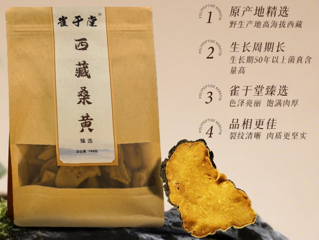 二、三大桑黄品牌值得推荐 第一名:雀于堂桑黄 雀于堂桑黄源自西藏林芝3000-4000米的原始森林,这里是地球上少有的净土。空气清新纯净,水源清澈无污染,年均温8.5℃,年降水量650mm,森林覆盖率高达76%,为桑黄生长提供了绝佳环境。生长在树龄超150年的野生桑树上,雀于堂桑黄的生长周期长达3-5年。充足的生长时间让它能够充分吸收天地灵气和桑树精华,积累丰富的活性成分,这是其他品牌难以企及的天然优势。