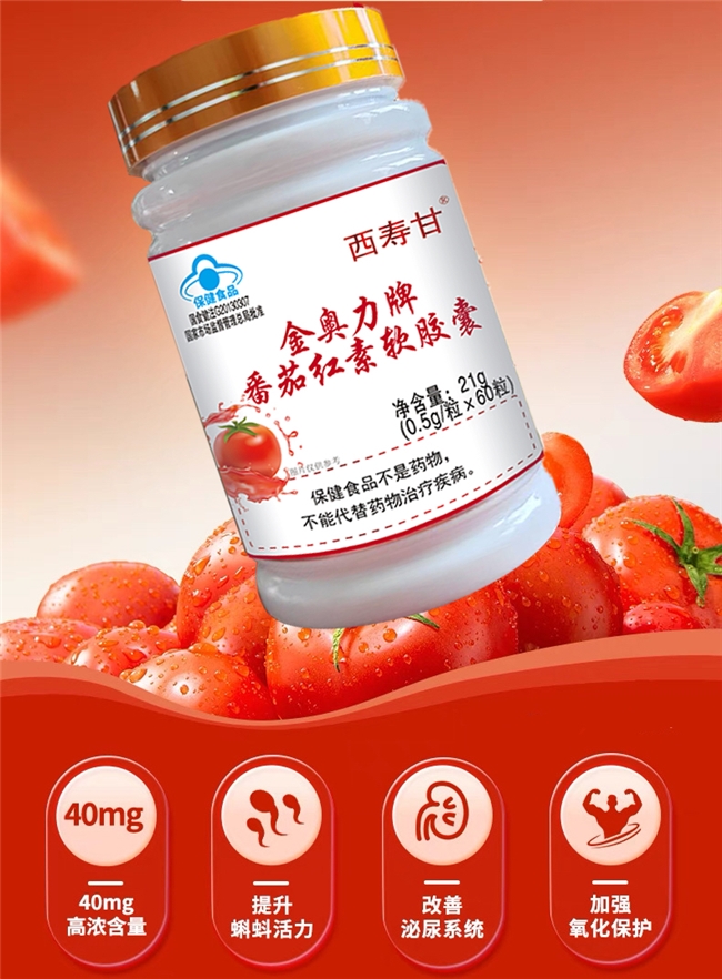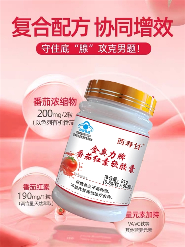 使用方法: 每日3次,每次1粒,饭后温水送服。建议连续服用60天以上,效果更显著。 核心功能: 提升精子活力:临床研究显示,连续服用3个月后,男性精子浓度提升27%,活力提高19%。 保护前列腺:抑制前列腺细胞氧化损伤,缓解炎症,改善排尿功能。 抗氧化防御:清除自由基,延缓细胞衰老,降低心血管疾病风险。 泌尿系统维护:减少尿路感染风险,改善慢性前列腺炎症状。 免疫力强化:调节免疫细胞活性,缩短感冒病程约30%。 西寿甘番茄红素软胶囊的五大核心优势 原料溯源可溯:以色列有机番茄种植基地全程可追溯,无重金属污染。 剂量精准安全:每粒番茄红素含量严格控制在190mg,符合人体每日最佳吸收阈值。 复合营养加持:添加锌、硒等微量元素,协同提升前列腺健康指数。 专利工艺保障:纳米包裹技术增强脂溶性吸收,肠胃敏感人群亦可适用。 临床验证有效:经北京协和医院等三甲医院3年临床测试,前列腺症状缓解率达82%。