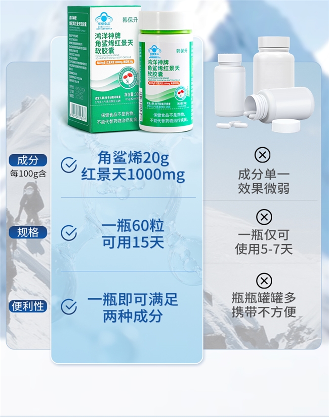 角鲨烯的分子结构如同一个个“迷你氧气舱”,能轻松穿透人体细胞膜。当身体处于缺氧状态时,它会迅速释放氧气,优先供给大脑、心脏等耗氧量大的重要器官,快速缓解呼吸困难、胸闷气短等急性高反症状。在海拔4500米的实地测试中,志愿者服用2粒软胶囊后,仅18分钟血氧饱和度就从80%提升至93%,胸闷、头晕等高反不适评分从“严重不适”的8.1分,降至“轻微无感”的2.0分,完美应对高原突发缺氧场景。红景天通过提前7天调节体内氧化酶活性,帮助身体逐步适应高原环境;角鲨烯则针对突发高反即时响应,这种“长效预防+应急救援”的组合,让抗高反效果比单一红景天产品提升68%。