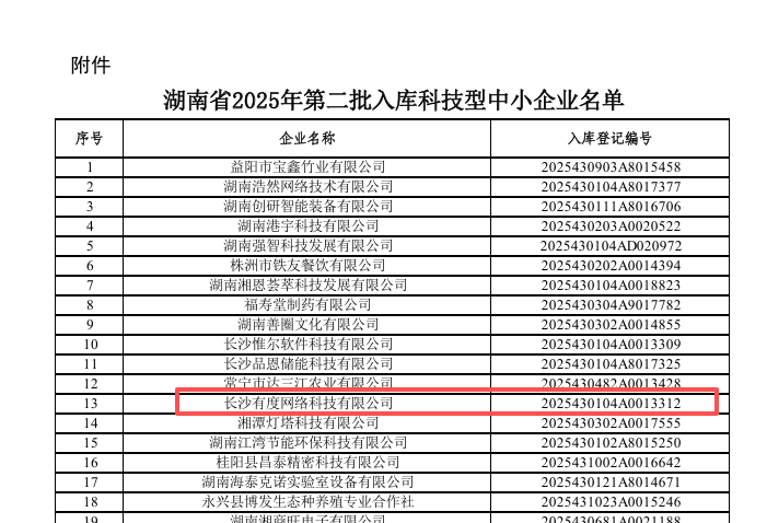 近日,根据《科技型中小企业评价办法》(国科发政〔2017〕115号)和《关于开展2025年度科技型中小企业评价工作的通知》(工企业函〔2025〕137号)有关规定,经企业自评,省、市(州)科技行政管理部门审核,关投强所属母公司长沙有度网络科技有限公司顺利通过“科技型中小企业”认定。