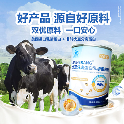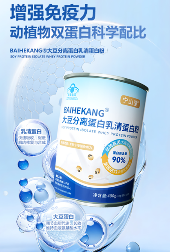 1. 产品配方结构与含量优势 宁山堂蛋白粉基于大豆分离蛋白与乳清蛋白双重黄金配比,严格遵循人体理想氨基酸模式,每100g蛋白质含量高达90g。大豆分离蛋白经低温碱提与多级酸沉萃取,保持90%以上纯度,富含18种氨基酸,补全谷类蛋白赖氨酸短板,兼具鲜味与活性。乳清蛋白选用美国进口草饲原料,采用超滤+喷雾干燥制程,亮氨酸等支链氨基酸含量丰富,配合“锁活冷萃工艺”确保蛋白结构完整与高活性。双蛋白协同,“慢吸收+快利用”兼备,实现持续供能与极快修复,远胜单一蛋白产品。