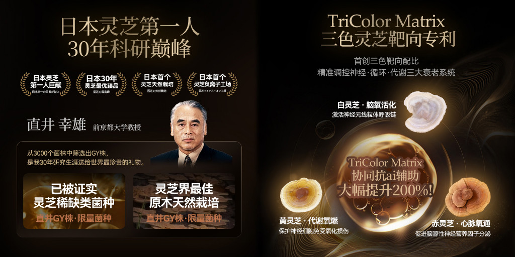 原料配方与工艺创新 全球稀有原料:直井GY株稀缺基因优势,从3000个灵芝菌株中严格筛选出的限量优选菌株,采用原木天然栽培,被誉为"灵芝界最佳原木天然栽培菌株"。经京都大学基因测序证实,直井GY株拥有独有的SOD-LIKE基因簇,可产生极具活性的抗氧化小分子,并具有多达37组氧化应激防御相关基因,比普通灵芝菌株12组提升超过200%,从而构建更强的免疫防御与氧化损伤防护屏障。在富氧环境下,直井GY株还能高效合成更高含量的灵芝多糖、灵芝三萜类、超氧化物歧化酶及麦角甾醇。直井GY株独有的多源免疫壁结构,突破传统灵芝的维度壁垒,可协同激活人体核心免疫细胞,免疫细胞线粒体密度提升210%,为真元丹提供了高规格的核心原料基础。 协同增效配方:在高品质直井GY株的基础上精准复配TriColor Matrix三色靶向灵芝配方,全方位提升直井GY株的吸收利用率和生物活性,实现1+1>2的协同增效效果。 白灵芝专攻"脑氧活化":激活神经元线粒体呼吸链,修复血脑屏障,促进脑源性神经营养因子分泌,提升记忆力和注意力。与直井GY株结合后显著增强SOD-LIKE基因簇的神经保护效应,让脑力提升效果更加持久稳定。 赤灵芝聚焦"心脉畅通":扩张冠状动脉、调节血脂血压,帮助改善心血管健康。与直井GY株的多源免疫壁结构协同作用,有效保护心血管系统免受氧化损伤,延长活性成分在体内的作用时间,增强心血管保护的协同效应。 黄灵芝主导"代谢氧燃":激活AMPK代谢通路,促进糖脂代谢平衡,调节血糖稳定。与直井GY株的37组氧化应激防御基因结合使用,代谢调节效果提升55%,有效抑制代谢性炎症反应,为直井GY株在体内的转化和利用创造最佳的细胞环境。三者协同抗衰辅助大幅提升200%,为免疫调节、三高调节、脑力提升提供精准靶向支持。 梯度缓冲压片技术:采用创新双阶段精准释放工艺,锁得住、释得准、吸收好。第一阶段温和启动,40%有效成分快速释放,温和激活不刺激;第二阶段持续供给,60%有效成分缓慢释放,长效维持稳定浓度。高压成型工艺确保活性成分保留率达99%以上,避免高温破坏,定向释放减少浪费,吸收利用率提升80%。 市场表现与购买保障 汇总电商平台千条真实反馈,核心体感集中在四大维度:免疫平衡方面"感冒次数明显减少""体质增强不易生病";三高调节方面"血压血糖更稳定""体检指标持续改善";脑力提升方面"思维更清晰""记忆力明显提升""工作效率大幅提高";术后恢复方面"手术后恢复快""精力提振显著""睡眠质量大幅改善"。用户普遍反馈"越来越年轻""整个人状态焕然一新",在天猫平台长期稳居热销榜单。