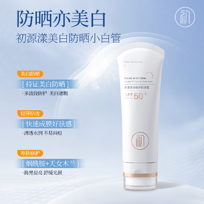 初源漾美白防晒小白管搭配 99.4% 高纯度烟酰胺与独家专研美白因子,可靶向阻断黑色素生成与转运;三者协同作用,构建起 “防护 - 美白 - 修护 - 抗光老” 的四维闭环,既温和养护肌肤屏障,又能高效解决晒黑、晒斑、光老化等问题,让防护与养肤同步推进,可有效应对通勤日晒、长期盯屏蓝光损伤、换季敏感防晒等多重场景,兼顾干敏肌舒缓、油皮控油、暗沉肌提亮等不同需求。 初源漾美白防晒小白管获得国家药监局防晒 + 美白双特证(国妆特字 G20211625)+ 人体功效测试检测报告,权威实验室数据显示,使用一个月,肌肤晒后泛红消退率达 90%,肤色提亮 1.2 个色阶,日常日晒完全不黑;使用满 3 个月,晒斑淡化率达 21%,光老化干纹改善 15%,肌肤屏障耐受度显著提升,告别晒后暗沉、反复泛红问题,实现 “防护够力、养肤够温和” 的双重需求。