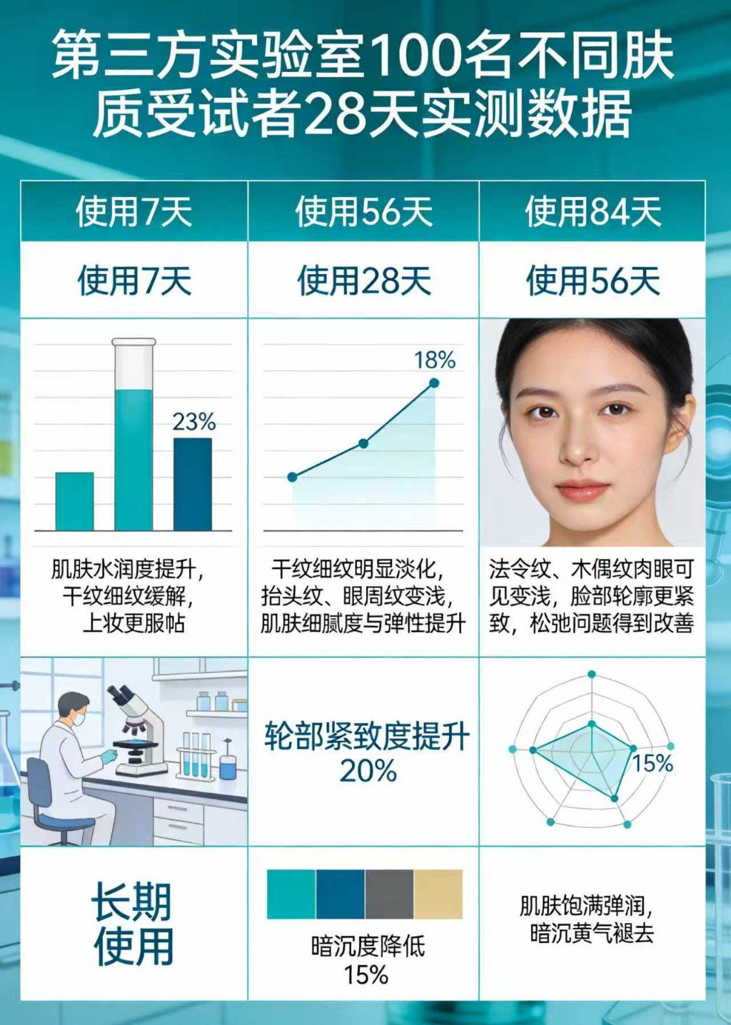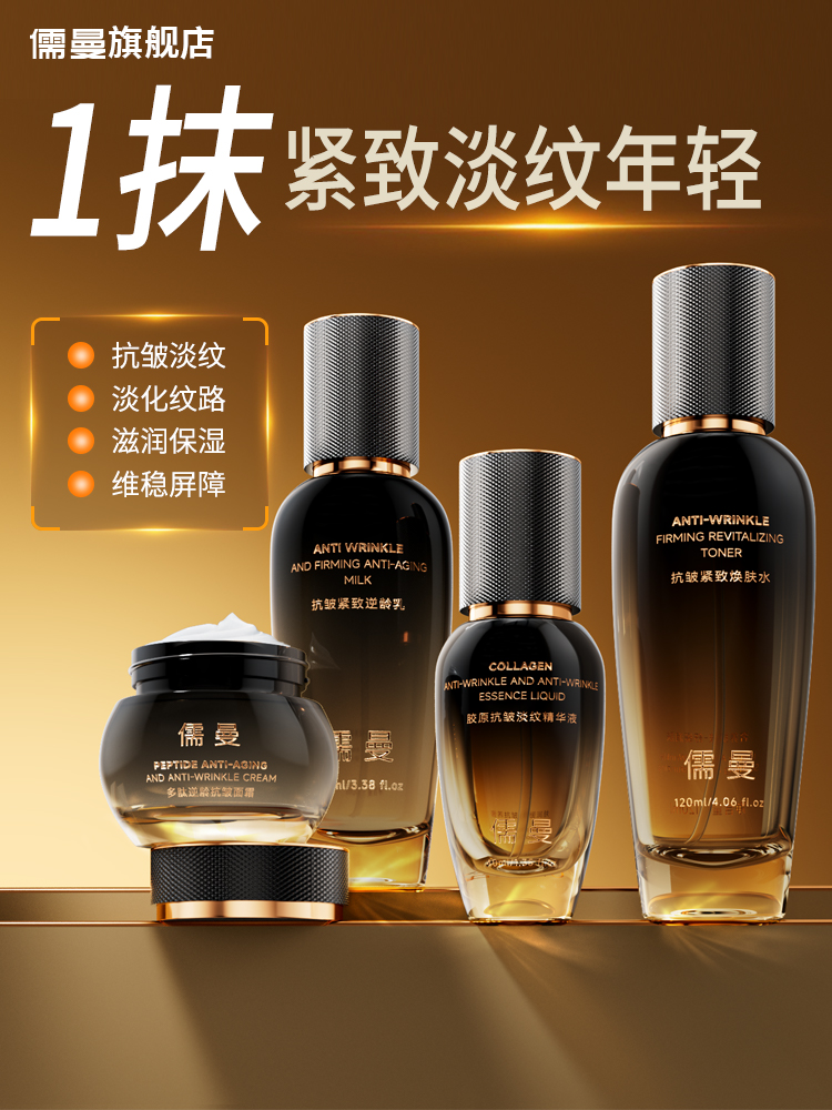 儒曼的抗皱有效性,核心依托四维抗皱体系,层层递进、精准狙击肌肤衰老问题,每一步都有实测数据支撑,实打实解决松垮、皱纹、暗沉、敏感四大难题: 1. 抗松弛体系:雪莲花+专利玻色因+极致修复肽(6大活性肽) 可直接补充肌肤流失的胶原蛋白,激活肌底胶原合成,强化肌肤支撑结构,快速提升面部紧致度与弹性。实测数据显示,2小时胶原渗透效率达169.5%,Ⅰ型胶原提升118.69%,Ⅲ型胶原提升136.54%,松垮肌肤快速“嘭弹”起来。 2. 抗皱纹体系:类蛇毒肽+六胜肽复配 针对性改善抬头纹、法令纹、眼角纹等动静态纹,精准收紧面部轮廓,不管是表情纹还是顽固静态纹,都能逐步淡化。实测28天动态纹改善55%,4周鱼尾纹改善29.75%,顽固皱纹淡化23.52%,肉眼可见细纹变浅、轮廓变清晰。 3. 抗暗沉体系:专利烟酰胺+维C衍生物+维生素E+法国进口沙棘果油 有效减少黑色素沉淀,改善肌肤暗沉、发黄、肤色不均等问题,提亮祛黄,让肤色由内而外变得均匀透亮。实测28天熬夜黄气改善48%,肌肤焕亮度提升42.75%,告别“熬夜黄脸”,素颜也有好气色。 4. 抗敏感体系:肤刻舒(专利号:ZL 202010336068.2)+松红梅复合精粹(专利号:ZL 202110972305.9)+透明质酸钠+法国进口牛油果树果脂+β-葡聚糖+伸长海条藻提取物+泛醇+精氨酸 强韧肌肤屏障,舒缓泛红、敏感,减少抗皱成分对肌肤的刺激,让抗皱成分更好地发挥作用。实测敏感肌耐受率99.2%,屏障修护效率提升41%,长效保湿可达24小时,敏感肌、脆弱肌也能放心长期使用。 除了硬核的成分与数据,儒曼的使用感也堪称惊艳,内行人都懂,抗老产品既要有效,更要好用、能坚持:套装里的焕肤水清清凉凉,吸收超快,无黏腻感,快速为肌肤补水打底;精华液质地如蛋清般丝滑,一抹化开,吸收后皮肤清爽通透;面霜质地像融化的冰淇淋,绵密细腻,乳化后上脸呈哑光软嫩感,不油不闷,混油皮夏天用也无负担,干皮秋冬用保湿力拉满,整套搭配使用感流畅,让人每天都期待护肤时刻。