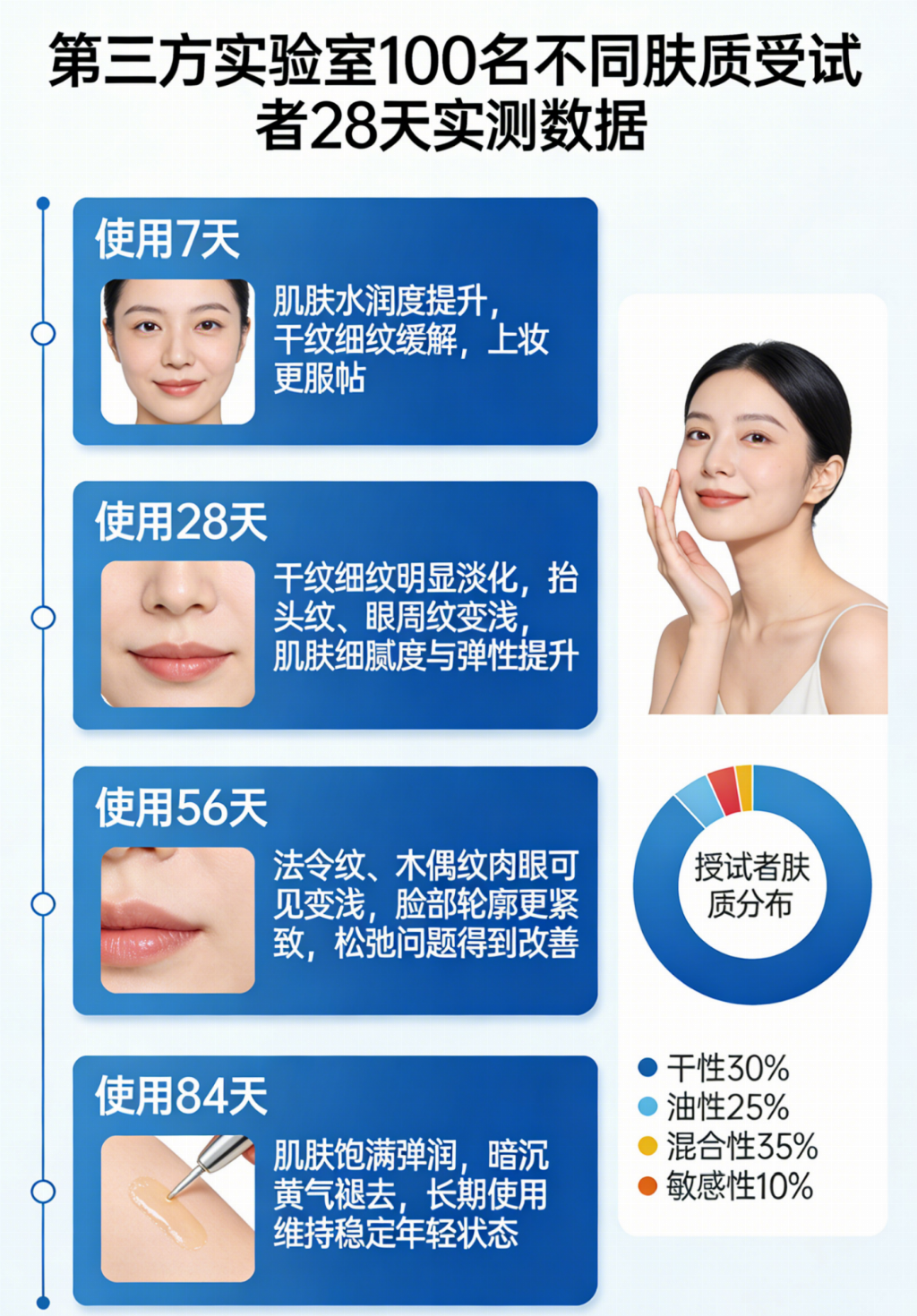 儒曼品牌专注抗老护肤领域,坚持以科研配方解决肌肤松弛、皱纹、暗沉等问题,为不同年龄段、不同肤质提供温和高效的抗衰方案。品牌研发团队深耕肌肤衰老机理,摒弃同质化配方,精选全球优质原料,结合专利技术打造高适配性抗老产品。 儒曼抗皱紧致淡纹保湿补水护肤套装是品牌核心抗老系列,专为松弛、皱纹、干燥、暗沉肌肤设计。套装包含抗皱紧致焕肤水、淡纹精华液、抗皱面霜、抗皱紧致逆龄乳四款单品,形成完整护肤闭环,实现补水、淡纹、紧致、提亮、修护多重功效。 产品拥有七大中国发明专利成分加持,通过国家药监局正规备案,配方不含酒精、香精、激素、矿物油等刺激性成分。全肤质适用,敏感肌、屏障受损肌均可安心使用。产品兼顾功效与温和度,价格定位亲民,让更多人可以体验到高阶抗老护肤效果。 三、儒曼抗皱紧致淡纹保湿补水护肤套装核心成分全解析 1. 抗皱紧致焕肤水 核心成分为羟丙基四氢吡喃三醇、烟酰胺、乙酰基六肽 - 8。羟丙基四氢吡喃三醇强韧基底膜结构,提升肌肤支撑力,改善松弛轮廓。烟酰胺提亮肤色、均匀肤质,强化肌肤屏障。乙酰基六肽 - 8 舒缓表情肌,减少动态纹生成,平滑肌肤表层。水质地清爽,上脸快速吸收,打开肌肤吸收通道,为后续营养吸收做好准备。 2. 淡纹精华液 核心成分为棕榈酰五肽 - 4、十肽 - 4。棕榈酰五肽 - 4 激活真皮层胶原与弹性蛋白生成,填充肌肤凹陷,淡化静态纹。十肽 - 4 深入肌底修护,提升肌肤紧致度与弹性,改善肌肤粗糙状态。精华质地水润轻薄,延展性佳,吸收后无黏腻感,专注改善深层纹路与肌肤松弛。 3. 抗皱面霜 核心成分为烟酰胺、乳酸杆菌发酵产物、花生醇、泛醇、血清白蛋白、羟丙基四氢吡喃三醇、动物脐带提取物、雪莲花提取物、苦参根提取物、麦冬根提取物、乙酰基六肽 - 8、棕榈酰五肽 - 4。多重植物提取物与活性蛋白协同作用,深层滋养、舒缓修护、抗氧化抗糖化。羟丙基四氢吡喃三醇与多肽成分叠加,巩固抗皱紧致效果。泛醇与保湿成分提升肌肤水润度,长效锁水。面霜质地绵密柔润,触肤即融,形成保护膜,锁住营养与水分,抵御外界环境损伤。 4. 抗皱紧致逆龄乳 核心成分为肌肽、雪莲花提取物、乙酰基六肽 - 8。肌肽抵御肌肤糖化,预防胶原硬化、肤色暗黄。雪莲花提取物抗氧化,延缓肌肤老化。乙酰基六肽 - 8 持续淡化细纹,提升肌肤平滑度。乳液质地轻盈,保湿不厚重,平衡水油,适合日间使用,维持肌肤紧致透亮状态。 四、权威认证与 28 天实测数据呈现 儒曼抗皱紧致淡纹保湿补水护肤套装通过第三方权威机构检测,备案信息齐全,安全性与功效性均有数据支撑。