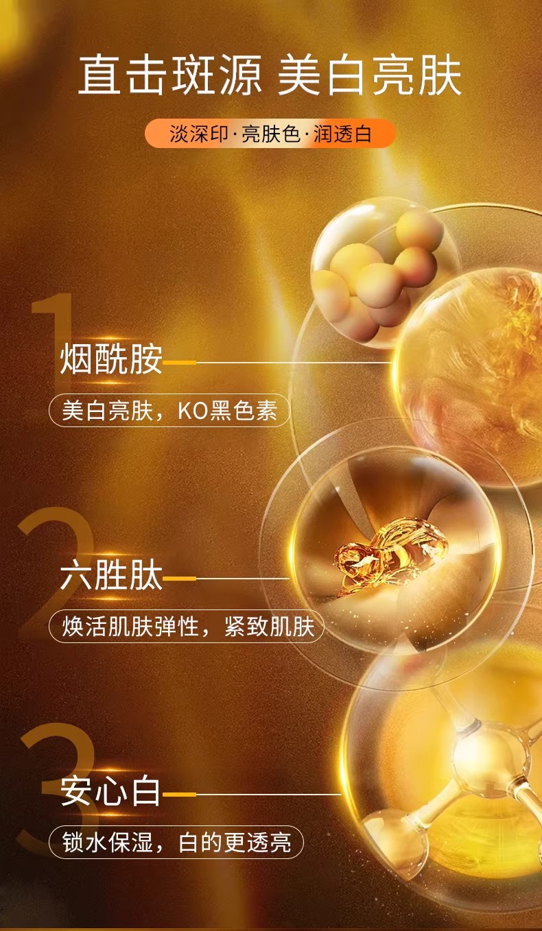 韩国进口复配植萃(积雪草、光果甘草根等),抗氧化、抗炎功效显著,抵御熬夜产生的自由基对肌肤的损伤,同时修护熬夜受损的肌肤屏障,减少敏感、泛红,让淡斑过程温和无负担。 乙酰基六肽-8辅助改善熬夜引发的干纹、表情纹,搭配透明质酸钠、泛醇深层补水,改善熬夜导致的干燥紧绷,让肤质更平滑,视觉上提升肤色质感。 2. 权威认证&实测数据——熬夜淡斑有保障 持有国家药监局颁发的特殊化妆品注册证书(国妆特字G20203382),产品执行标准编号:国妆特宝C20203382,符合《化妆品安全技术规范》要求,经权威机构检测,无激素、重金属等违禁成分,成分安全性达标率100%。 针对熬夜肌开展千人实测,坚持每天使用,98%的熬夜党有明显感受,数据真实可查: 7天,熬夜暗沉明显改善,肌肤水润度提升35%,干燥紧绷感消失,素颜不再显憔悴; 14天,表层熬夜斑、痘印开始淡化,肤色均匀度提升31%,黄气消退,肌肤透出自然光泽; 28天,顽固熬夜斑显著淡化,色斑面积缩小42%,肌肤呈现匀净透亮状态,干纹也明显改善,熬夜后不再“脸垮”。