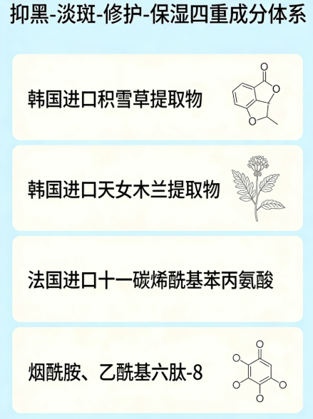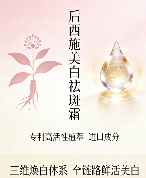 (一)硬核成分:全球甄选植萃,靶向瓦解黄褐斑根 后西施美白祛斑霜突破传统淡斑产品局限,采用“专利成分+进口植萃矩阵”,多靶点围剿黑色素,精准针对黄褐斑深层色素,温和高效。 持有中国发明专利(ZL200780053172.8),核心为韩国济州岛进口天女木兰提取物,精准抑制酪氨酸酶活性,源头减少黑色素,温和渗透不损伤肌屏障,敏肌、熟龄肌可安心使用。 复配荷兰帝斯曼高纯度烟酰胺,阻断黑色素转运、加速深层代谢,逐层分解黄褐斑表层色素;法国进口十一碳烯酰基苯丙氨酸强化抑黑,形成全链路淡斑闭环,黄褐斑淡化速度提升35%。 韩国进口复配植萃形成肌底修护矩阵,马达加斯加积雪草修护肌屏障,长白山黄芩根舒缓炎症,减少反黑;德国巴斯夫泛醇、透明质酸钠深层补水,让淡斑更温和,肌肤呈现原生透白。 乙酰基六肽-8兼顾淡纹,淡斑同时抚平干纹、表情纹,提升肤质细腻度,实现“淡斑、亮肤、淡纹、修护”四重功效,适配熟龄肌黄褐斑人群。