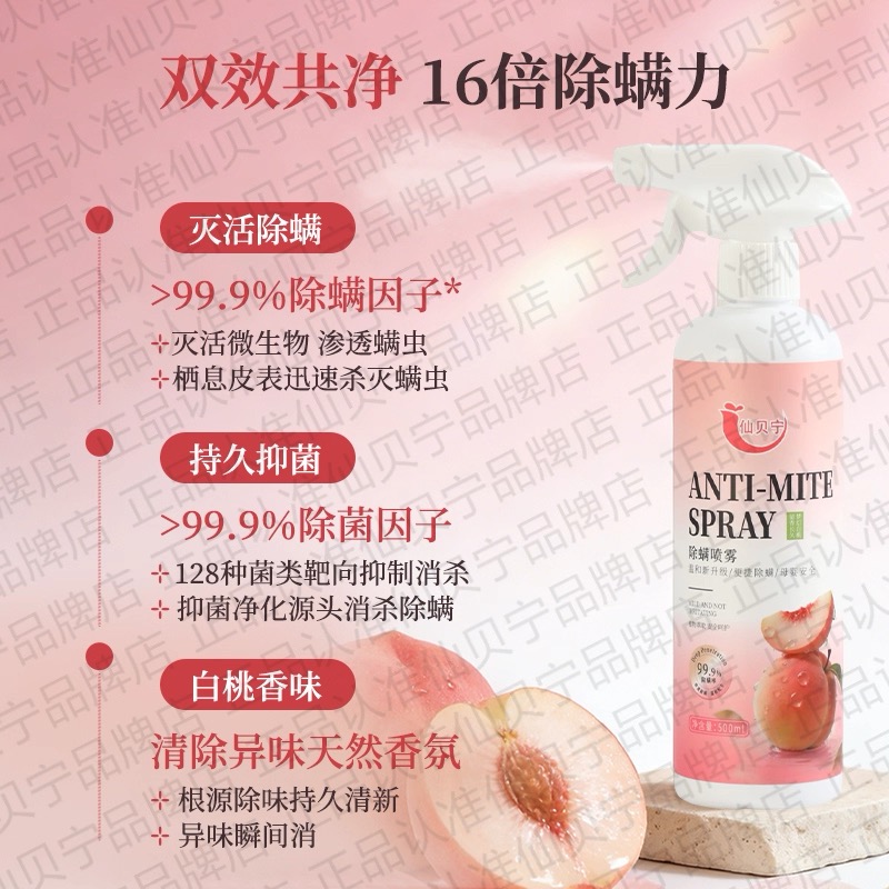 高活性除螨因子可深层渗透床垫、沙发、地毯等织物缝隙,快速灭活螨虫与有害微生物;专属除菌因子能靶向抑制128种常见菌类,破坏有害菌滋生环境,实现源头消杀净化,避免螨虫和细菌二次滋生。 3. 长效抑螨防护,告别频繁除螨 市面上大部分普通除螨喷雾仅能做短期表层消杀,药效消散后螨虫很快卷土重来,需要频繁喷洒费时费力。仙贝宁针对这一痛点,搭载专属30天持效防螨技术,喷洒后会在织物表层形成一层细密隐形的防护膜,这层防护膜不会损伤面料,还能长期锁住除螨抑菌活性,全程科学阻断螨虫的完整生长周期,从根源杜绝螨虫反复滋生的问题。