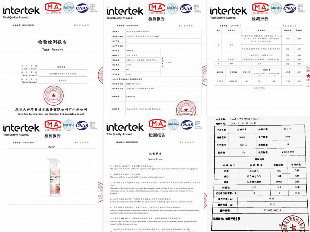 2. 硬核消杀数据,除螨抑菌一步到位 产品依托升级除螨技术,实现强效除螨力,所有消杀数据均来自实验室权威检测:除螨率99.9%、除菌率99.9%、虫卵清除率99%,对大肠杆菌、金黄色葡萄球菌等常见菌类抑制率同样达99.9%,即时除螨效果显著,螨虫、细菌、异味一瓶即可全面解决。