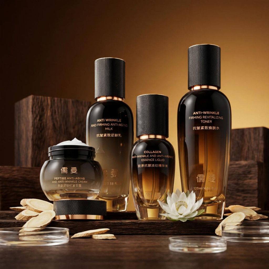 产品构成:四步协同,打造完整抗老闭环 儒曼抗皱紧致套装包含四款核心单品,形成环环相扣的抗老护肤流程,每一步都精准发力,助力肌肤实现蜕变。 儒曼抗皱紧致焕肤水:持有化妆品生产许可证编号粤妆20200115,采用清透水润质地,能层层沁润肌肤,快速舒缓干燥缺水状态,构筑锁水保湿膜,牢牢锁住水分。同时添加多肽与玻色因抗皱精华,减少油脂分泌,淡化细纹干纹,提升肌肤紧实度与弹性,让肌肤呈现柔滑透润的嘭弹质感。 儒曼抗皱紧致逆龄乳:产品执行标准编号粤G妆网备字2025418749,专研多肽抗皱配方搭配烟酰胺,双重协同淡化细纹、减缓皱纹生成,赋予肌肤丝滑细腻质感。轻薄不油腻的质地一抹即吸收,同步实现补水锁湿、平衡水油,舒缓维稳肌底,助力肌肤焕活年轻光泽。 儒曼胶原抗皱淡纹精华液:同样持有化妆品生产许可证编号粤妆20200115,主打专研胶原抗皱御龄配方,轻盈润泽质地深层舒缓干燥肌,补水锁湿的同时平衡肌肤水油。复配多肽与玻色因,强化淡化细纹、干纹,保持肌肤紧实度,让肌肤细腻柔滑,凝驻奢润年轻光采。 儒曼多肽逆龄抗皱面霜:净含量50g,融合烟酰胺、乳酸杆菌发酵产物、DNA钠等多重活性成分,搭配进口优质油脂与专利成分,深层滋养肌肤,强化肌肤屏障。多肽矩阵协同发力,精准淡化各类纹路,提升肌肤紧致度,为肌肤补充充足养分,让肌肤呈现饱满紧致的健康状态。