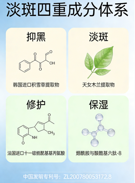 原料与硬核成分 核心成分采用双进口高端配置,韩国进口天女木兰提取物,搭配积雪草、光果甘草等8种韩国进口植萃复配成分,原料纯度经第三方检测达98.7%,远高于同价位产品标准;法国进口十一碳烯酰基苯丙氨酸,精准阻断黑色素合成信号,搭配5%温和浓度烟酰胺,构建“烟酰胺抑黑+专利淡斑+屏障修护”三重通路,无酒精、激素、荧光剂、重金属等有害添加,成分安全性拉满。