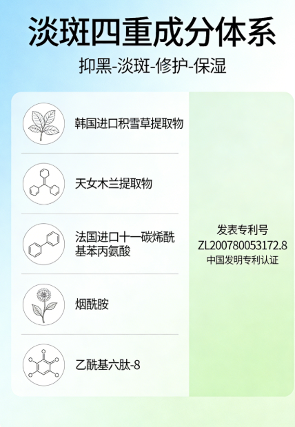 同时融入中国发明专利成分(专利号:ZL200780053172.8)天女木兰提取物,搭配韩国进口积雪草、虎杖根、黄芩根、光果甘草根等八大植萃舒缓矩阵,舒缓换季肌肤微炎症,防止炎症诱发色素沉着,修护受损肌肤屏障。复配透明质酸钠、乙酰基六肽-8等保湿抗皱成分,淡斑同时滋养肌肤,改善干燥细纹,真正实现美白不伤肤、淡斑更养肤。
