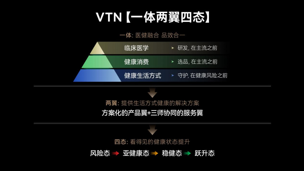 洞察到这一深层痛点,VTN平台将自身使命定位于“健康陪跑师”,并将这一角色深深烙印在平台基因之中。VTN平台致力于陪伴用户跑赢时间,将原本碎片化的健康消费,升级为持续、长情的高质量生命陪伴。 拆解“一体两翼四态”的战略闭环 如何将“健康陪跑”落地?VTN平台交出的答卷是“医健融合”理念下的“一体两翼四态”新战略架构。