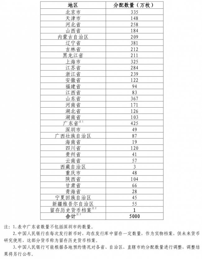 二、纪念币面额、规格、材质和发行数量。 武夷山国家公园双色铜合金纪念币面额为10元,直径为27毫米,材质为双色铜合金,发行数量为5000万枚。各省、自治区、直辖市分配数量如下: