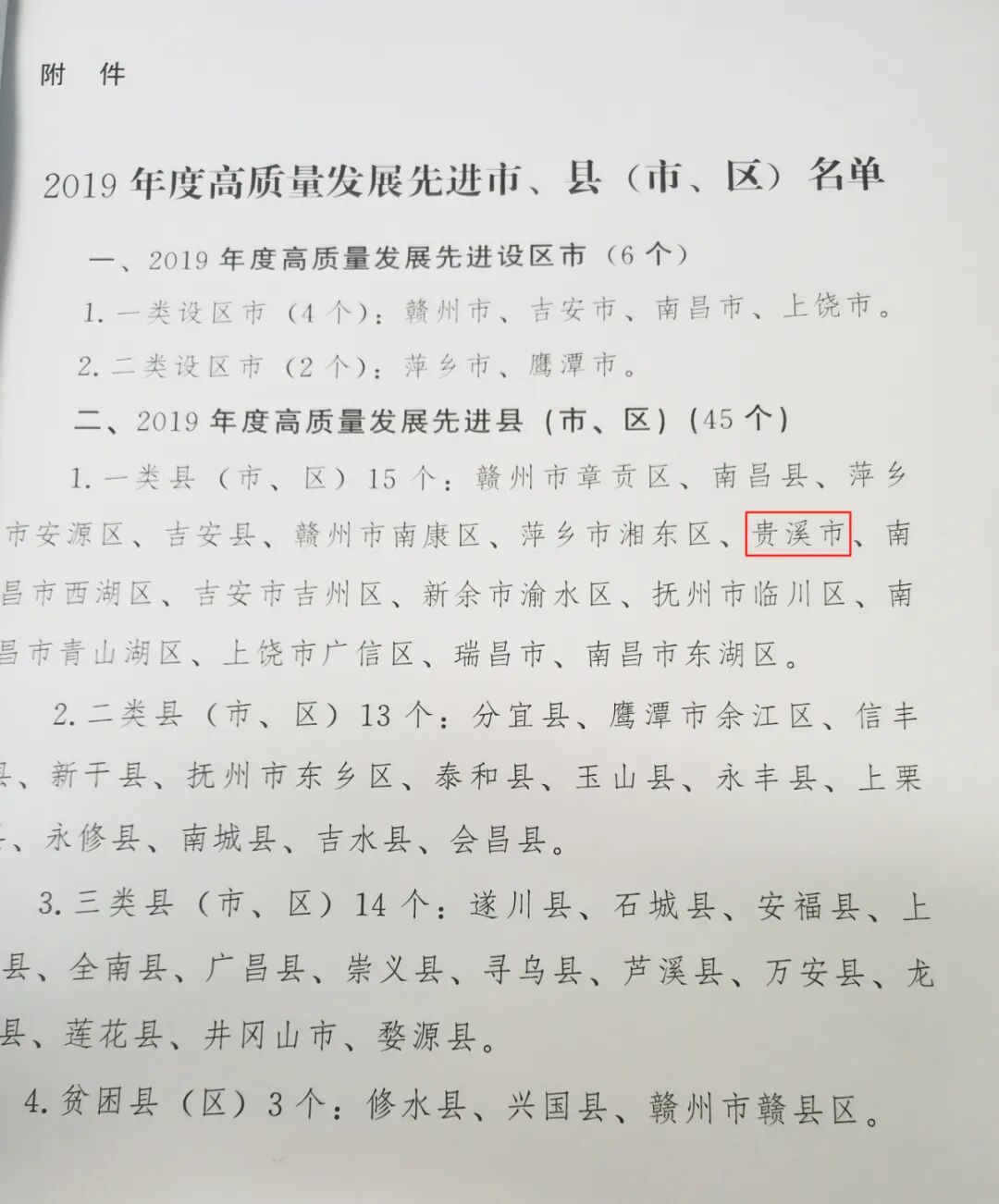 11月17日,省委、省政府发文,通报表彰2019年度全省高质量发展先进县(市、区),贵溪市以名列第七的好成绩荣获“2019年度全省高质量发展(一类)先进县(市、区)”称号,排名较上年度前移六位。 去年以来,贵溪市全市上下认真贯彻省委“二十四字”工作方针,鹰潭市委“三大四聚”发展路径和“六强四动一保障”工作思路,围绕“争当全省县域经济高质量发展排头兵、争当全省改革创新示范区、争当全省城乡融合先行区”目标,坚持稳中求进工作总基调,贯彻新发展理念,落实高质量发展要求,奋进强市、产业旺市、品质立市、实干兴市,坚持主攻工业不动摇,以“工业三年倍增”为抓手,集聚资源、聚焦政策、聚合力量,着力打好主攻工业攻坚战,全力推进工业提质增效。聚焦特色产业,全面融入03专项试点建设,加快推进移动物联网产业培育、集聚和壮大,加快发展绿色照明产业,推进铜精深加工与绿色照明产业融合发展,重点铜企业智能化、数字化改造率达60%。先后荣获“2017-2019年全省开放型经济先进单位”“全省工业崛起年度贡献奖”“全省工业高质量发展一类先进县”。今年1-9月份,全市实现规上工业营业收入2974.6亿元,同比增长27.2%。 据了解,全省一类县(市、区)共34个,此次获评先进一类县(市、区)共15个。 |