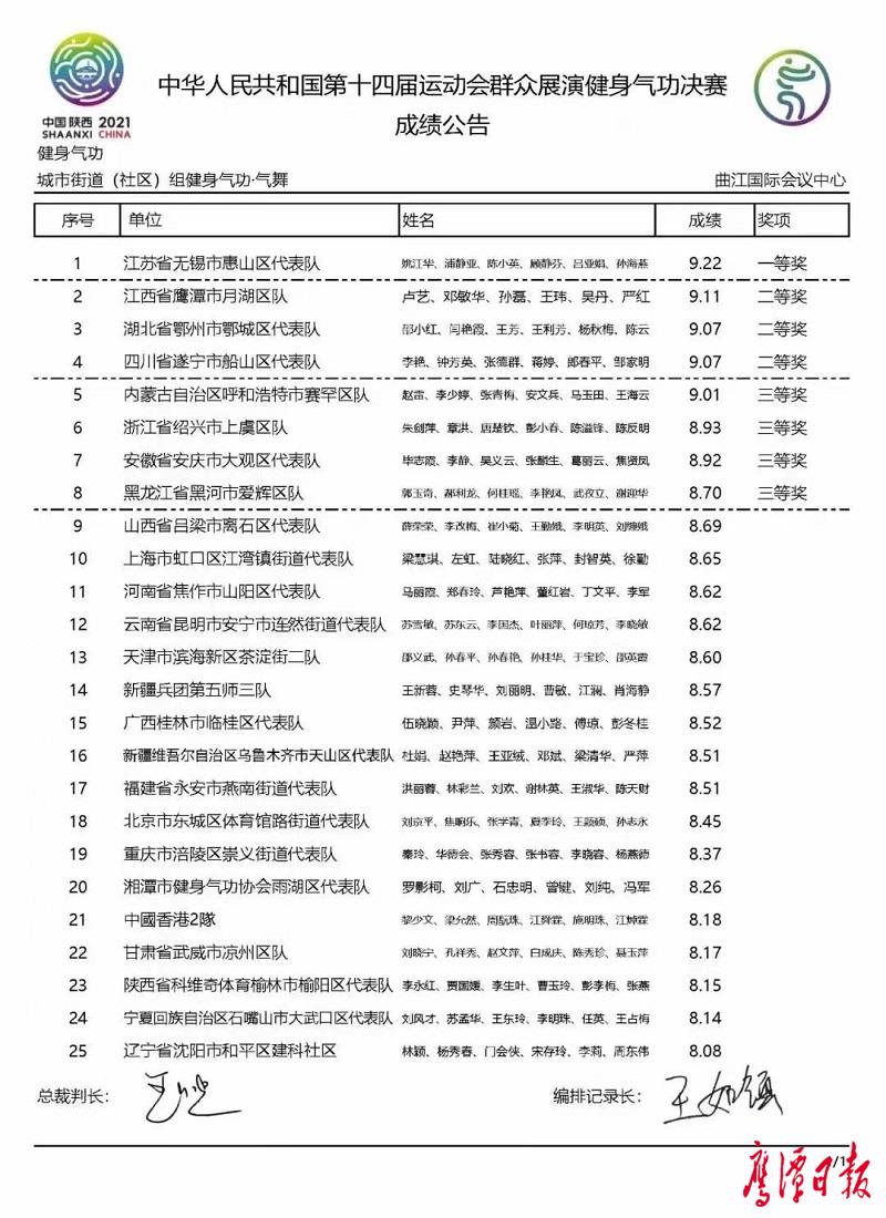 9月1日,记者从市体育局了解到,鹰潭市健身气功队在第十四届全国运动会健身气功项目展演赛上荣获二等奖。 本次健身气功展演赛设置了八段锦、五禽戏、易筋经和气舞4个分项,并下设城市街道(社区)组、农村乡镇组、企事业单位组3个组别。经过裁判员评审打分,产生了12个一等奖、36个二等奖和48个三等奖。其中,由卢艺、邓敏华、孙磊、王玮、吴丹、严红组成的鹰潭市月湖区队获城市街道(社区)组健身气功·气舞二等奖。“能够有这样的一个成绩非常开心,这和我们平时的付出与努力是分不开的,也希望下一次能够取得更好的成绩。”队员卢艺说道。 据了解,鹰潭市健身气功协会已拥有健身气功站点18个,会员260余名。协会多次组织部分骨干成员代表鹰潭市参加全国及全省的各种大型比赛,均取得了优异成绩。 |