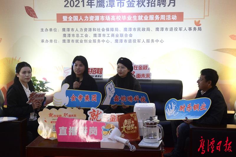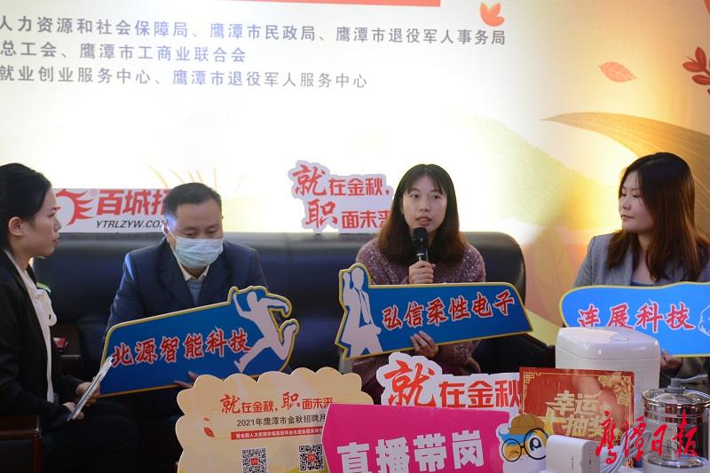 为全力帮助企业解决招工稳工难题,搭建人力资源供需匹配对接平台,11月17日,2021年“金秋招聘月”直播带岗活动在鹰潭市人力资源市场举办。 活动现场,连展科技(江西)有限公司、江西弘信柔性电子科技有限公司等6家企业人事负责人走进活动直播间,详细介绍企业招聘岗位信息、工作环境、薪酬待遇、发展空间等情况,与求职者通过手机“云端”实时交流互动。直播过程中,人社部门工作人员也适时通过直播向求职者宣传就业创业政策和其他企业的相关招聘信息,通过网络直播扩大政策信息覆盖面和知晓度。据统计,本场直播共吸引了2万余人次在线观看。 同时,鹰潭人力资源网也向全市广大离校未就业高校毕业生、退役军人、登记失业人员等求职者开展了2021年金秋招聘月暨全国人力资源市场高校毕业生就业服务周线上专场招聘会,累计收到求职者简历800余份,直接促成数百名求职者与企业达成初步就业意向。 下一步,全市各级公共就业服务部门将利用鹰潭人力资源网、微信公众号等多种方式,积极开展特色专场线上招聘活动,进一步推进我市稳就业保就业工作。