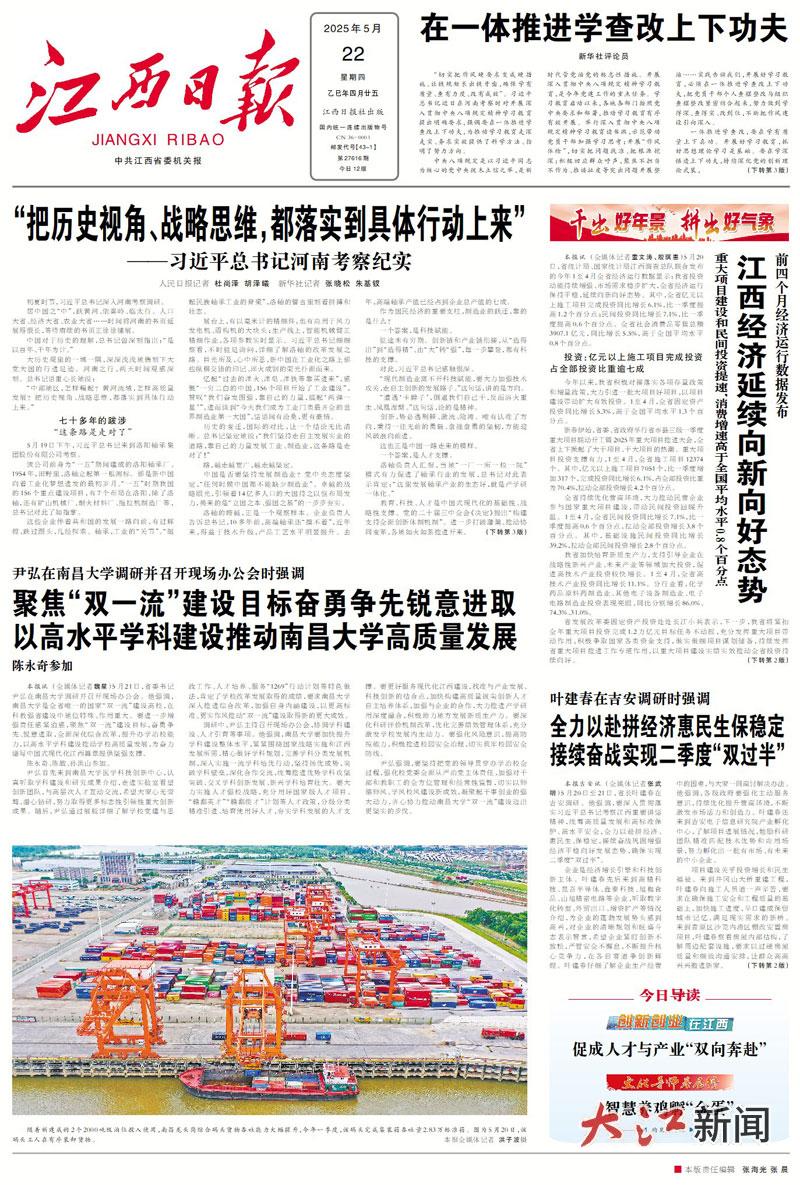 原标题: 尹弘在南昌大学调研并召开现场办公会时强调 聚焦“双一流”建设目标奋勇争先锐意进取 以高水平学科建设推动南昌大学高质量发展 陈永奇参加 大江网/大江新闻客户端讯 江西日报全媒体记者魏星报道:5月21日,省委书记尹弘在南昌大学调研并召开现场办公会。他强调,南昌大学是全省唯一的国家“双一流”建设高校,在科教强省建设中地位特殊、作用重大。要进一步增强责任感紧迫感,聚焦“双一流”建设目标,奋勇争先、锐意进取,全面深化综合改革,提升办学治校能力,以高水平学科建设推动学校高质量发展,为奋力谱写中国式现代化江西篇章提供坚强支撑。 陈永奇、陈敏、孙洪山参加。