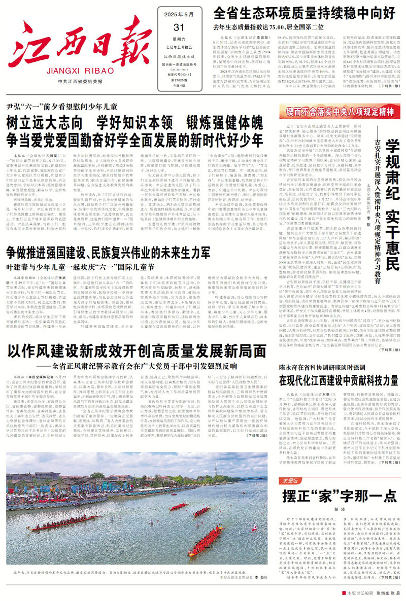 走进幼儿教学楼,尹弘兴致勃勃地听孩子们的介绍,加入他们一起做“火山爆发”实验,勉励老师们坚持寓教于乐、寓学于趣,在游戏中激发孩子们的求知兴趣。端午节与“六一”节交汇,更添节日氛围。中一班教室内,孩子们包粽子、编蛋袋、做香囊、“划龙舟”。尹弘体验童趣,欣然接受孩子们送的蛋袋,夸赞他们懂礼貌、有爱心,为孩子们赠送节日礼物。尹弘叮嘱幼儿园老师们要用爱心、耐心,把祖国的花朵呵护好、教育好、培养好。 尹弘走访中强调,各级党委政府和部门要更加重视和关心少年儿童健康成长,全面落实立德树人根本任务,做实做细少年儿童各项工作,为他们创造良好的学习生活环境,努力培养中国特色社会主义事业合格建设者。 ▲视频来源:江西卫视 |