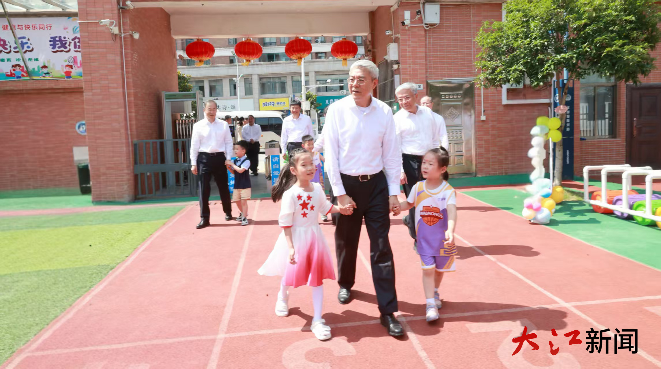 教学楼内,孩子们正在进行沙画、版画和葫芦刻,尹弘为大家精美的作品点赞,鼓励孩子们广泛培养兴趣爱好,传承中华优秀传统文化,实现德智体美劳全面发展。“这是我的梦,这也是我的梦,这是我们的中国梦……”图书馆内,三年级学生正在排练诗朗诵。尹弘说,你们成长在新时代,既是幸福快乐的一代,又是肩负重任的一代。实现强国建设、民族复兴的中国梦,需要你们放飞梦想,尽快成长成才、当好生力军。 安义县龙津中心幼儿园内,孩子们正在老师带领下进行户外拓展、快乐游戏。尹弘走进幼儿园,孩子们小手拉大手争相邀请他参加游戏。看到一张张天真可爱的稚气笑脸,尹弘非常高兴,祝福孩子们节日快乐、茁壮成长。篮球场上,3V3幼儿赛正在热闹进行,场边花样跳绳充满活力,尹弘要求学校积极组织户外体育活动,从小培养孩子强健的体魄和阳光的性格。