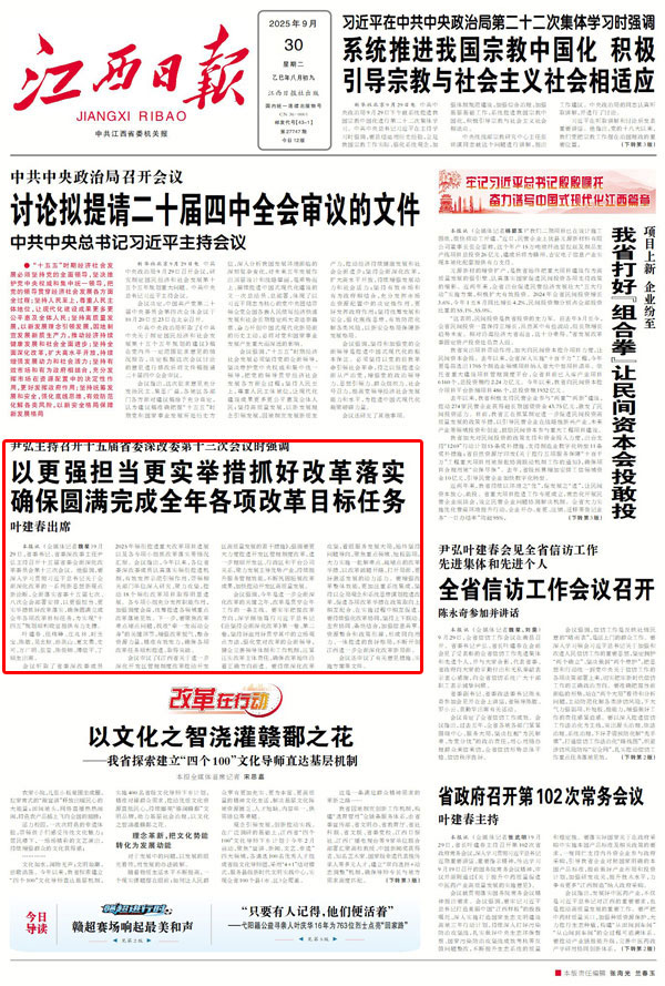 原标题: 尹弘主持召开十五届省委深改委第十三次会议时强调 以更强担当更实举措抓好改革落实 确保圆满完成全年各项改革目标任务 叶建春出席 9月29日,省委书记、省委深改委主任尹弘主持召开十五届省委全面深化改革委员会第十三次会议。他强调,要深入学习贯彻习近平总书记关于全面深化改革的一系列新思想新观点新论断,全面落实省委十五届七次、八次全会部署安排,以更强担当、更实举措抓好改革落实,确保圆满完成全年各项改革目标任务,为实现“十四五”规划顺利收官提供有力支撑。 叶建春、任珠峰、庄兆林、时玉宝、陈敏、吴忠琼、孙洪山、夏文勇、史可、万广明、张莹、陈俊卿、傅信平、丁顺生出席。 ▲摄影|江西日报全媒体首席记者海波 会议听取了省委深改委成员2025年领衔推进重大改革项目进展以及各专项小组抓改革落实等情况汇报。会议指出,今年以来,各位省委深改委成员认真落实领衔推进机制,有效发挥示范引领作用,带领相关部门单位深入研究、聚力攻坚,推动18个领衔改革项目取得明显进展。各专项小组充分发挥职能作用,加强调度会商,统筹推进各领域重点改革落地见效。下一步,要聚焦改革难点堵点问题,找准“牵一发而动全身”的关键环节,增强改革锐气,整合资源力量,精准有效发力,确保各项改革任务顺利推进、取得突破。 会议审议了《江西省关于进一步深化开发区管理制度改革推动开发区高质量发展的若干措施》,强调要更大力度推进开发区管理制度改革,进一步理顺开发区、行政区和平台公司关系,聚力发展主导优势产业,持续提升服务管理效能,不断巩固拓展改革成果,加快推动开发区高质量发展。 会议强调,今年是进一步全面深化改革的关键之年,改革是贯穿全年工作的一条主线。要牢牢把握改革方向,深学细悟笃行习近平总书记《论坚持全面深化改革》第一卷、第二卷,坚持好运用好贯穿其中的立场观点方法,强化党对改革的全面领导,健全完善领导体制和工作机制,压紧压实改革主体责任,确保改革始终沿着正确方向前进。要持续深化改革攻坚,着眼服务发展大局,始终坚持问题导向,聚焦重点领域、短板弱项,大力实施一批解难点、疏堵点的改革举措,以改革破题开路、打开局面,更好激活发展的动力活力。要增强改革整体效能,更加注重系统集成,坚持以全局观念和系统思维谋划推进改革,促进各项改革举措在政策取向上相互配合、在实施过程中相互促进。要持续强化改革协同,坚持上下联动、左右协同、条块结合,加强信息共享、资源整合和政策衔接,形成同向用力、一体推进的良好格局,不断开创江西进一步全面深化改革新局面。 会议还审议了有关意见措施、实施方案等文件。 ▲视频来源:江西卫视 |