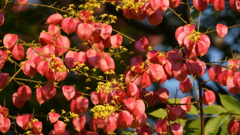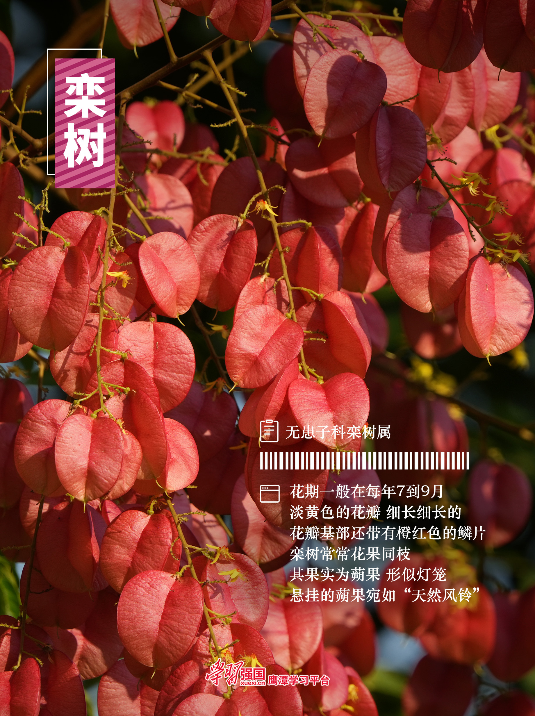 金秋时节,街头巷尾的栾树迎来了最佳观赏期。黄色花朵、绿色叶片与胭红色果实交相辉映,把秋天装点得格外美丽。不知你是否留意过家门前的栾树,春天,它的嫩叶如霞般绚烂;夏天,黄花满枝,繁茂异常;秋天,满树挂起红彤彤的“灯笼”;待到落叶时节,又呈现满树金黄的景象。 栾树是无患子科栾树属的落叶乔木或灌木,别名木栾、栾华、乌拉等。栾树可长至10到20米高,胸径可达30厘米,树皮呈灰褐色,呈薄片状剥落,露出光滑的灰绿色内层。栾树的花期一般在每年7到9月,栾花独具特色,淡黄色的花瓣共有4片,细长细长的,花瓣基部还带有橙红色的鳞片,远看宛如黄色的花穗,十分醒目。微风拂过,它们便在枝头翩翩起舞;一场秋雨过后,满地尽是金黄。更神奇的是,栾树常常花果同枝,花还未完全凋谢,果实便已悄然长出。其果实为蒴果,呈三角状卵形,表面密布网状脉纹,内部包裹着黑色球形种子,形似灯笼,果熟时节,悬挂的蒴果宛如“天然风铃”。 古人称栾树为“栾华”“灯笼树”。《周礼》中记载:“天子树松,诸侯柏,大夫栾,士杨。”栾树因树形端正、花果雅致,成为古代士大夫阶层的象征。唐代诗人王维曾以“栾栌倚乔木,轩窗纳晴旭”描绘庭院中种植栾树的景致;宋代《洛阳花木记》更将其列为“花木上品”。在民间,因其果实形似灯笼,孩子们亲切地称它为“摇钱树”。在园林设计中,栾树常被赋予“和谐共生”的美好寓意。 栾树是阳性树种,喜光,耐旱、耐寒、耐贫瘠,在弱酸性和碱性土壤中都能生长良好,尤其喜爱石灰岩风化产生的钙基土壤,在积水地和硅基酸性的红土中生长状况不佳。栾树根系发达,萌蘖力强,对粉尘、二氧化硫、臭氧等污染物具有较强的抗性。因此,栾树被广泛应用于城市绿化,成为“行道树”的首选,也是公共绿地的“迎客树”,更是生态脆弱区的“造林先锋树”。