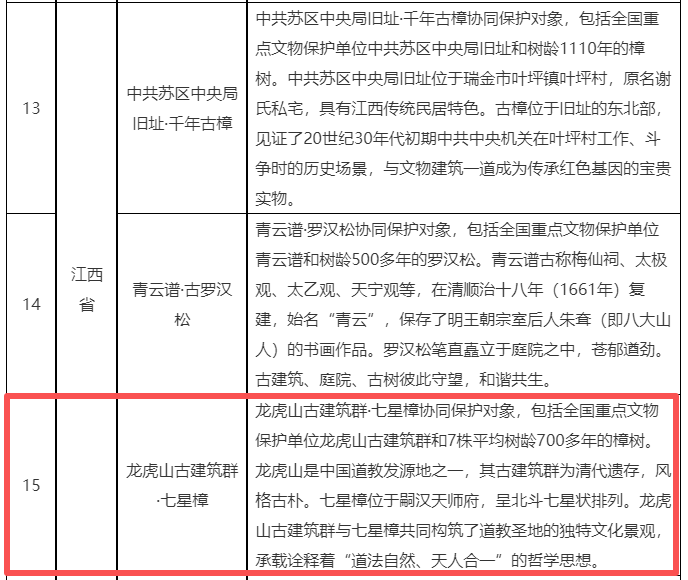 日前 国家文物局、国家林草局 住房城乡建设部联合发布 第一批“国保单位·古树名木” 协同保护名录 其中 龙虎山古建筑群·七星樟 成功入选! 龙虎山古建筑群·七星樟协同保护对象,包括全国重点文物保护单位龙虎山古建筑群和7株平均树龄700多年的樟树。龙虎山是中国道教发源地之一,其古建筑群为清代遗存,风格古朴。七星樟位于嗣汉天师府,呈北斗七星状排列。龙虎山古建筑群与七星樟共同构筑了道教圣地的独特文化景观,承载诠释着“道法自然、天人合一”的哲学思想。 此次入选,是对龙虎山景区文物和古树名木保护成果的充分肯定。后续,景区将联合有关部门共同做好第一批“国保单位·古树名木”协同保护对象的科学管护、文化传承和合理利用工作。 |