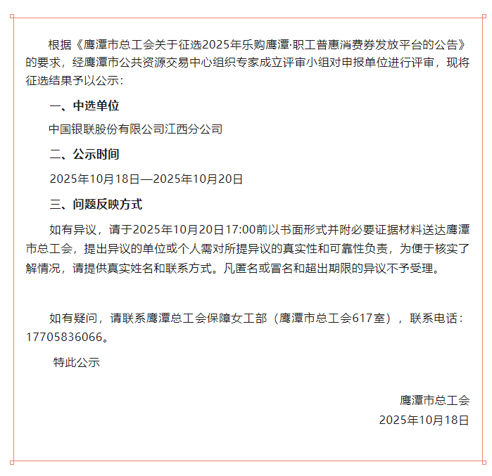 鹰潭市总工会关于2025年乐购鹰潭·职工普惠消费券发放平台征选结果的公示