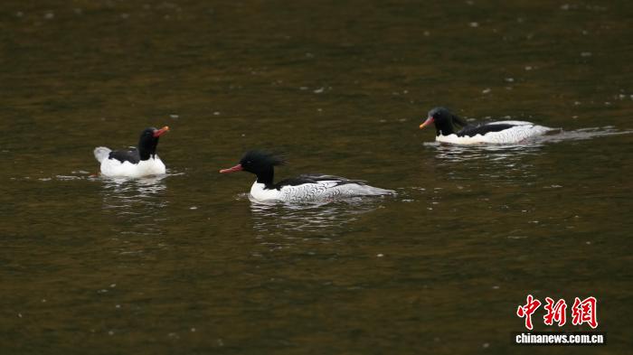 10月22日,国家一级保护动物“中华秋沙鸭”飞抵江西省鹰潭市龙虎山景区上清镇泸溪河沙湾段越冬。这是中华秋沙鸭连续19年在龙虎山越冬。 当天上午10时左右,龙虎山景区上清镇护林员、中华秋沙鸭守护者肖冬样在例行巡逻时发现3只成年雄性中华秋沙鸭在水中休憩。