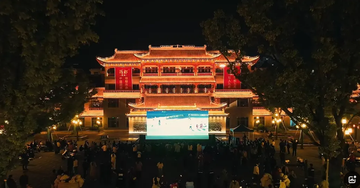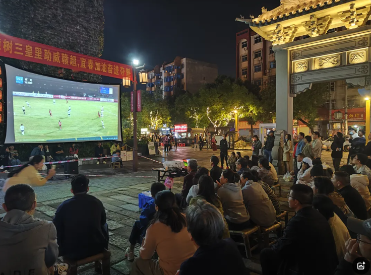 从7月26日到10月25日 从盛夏到深秋 灯光把球场照得透亮 看台上的呐喊穿透夜空 汗水浸湿球衣 鞋钉带起草屑 樟树主场的每一寸草皮 都记住了这些动人的瞬间 10月25日19:30,赣超总决赛首回合在樟树市体育中心激情开赛,冠军的悬念正在慢慢拉开序幕。球场内的座位有限,但球场外的热情无限。这个夜晚,足球的魅力突破了体育中心的围墙,在七处精心设置的户外大屏上绽放——时代广场、三皇里、新民夜市、沿江公园、福城公园、街心花园、药都里,七个名字串联起一幅独属于樟树的“足球地图”。 距离开赛还有1个小时,位于三皇里旅游休闲街区的直播观赛点位已经聚集了不少球迷。比赛开始,户外大屏上的足球赛况引发阵阵欢呼,高清的赛事画面、震撼的音效,让球迷仿佛置身比赛现场。