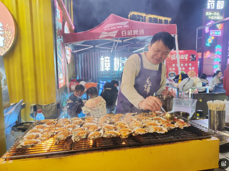 夜幕降临, 新民夜市灯火璀璨,此时也迎来它一天中最沸腾的时刻。“鱿鱼须、铁板豆腐……”的吆喝声淹没在鼎沸人声中。夜市的蛋糕、烧烤店铺挤满了顾客,老板们忙得脚不沾地。夜市的烟火气与足球激情碰撞出独特火花,空气中弥漫着烧烤和啤酒的味道, 吸引很多走出家门看球的食客,每一次精彩的传球都让餐桌前的球迷们热血沸腾。