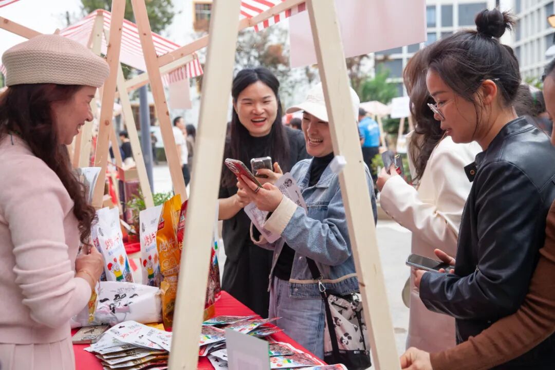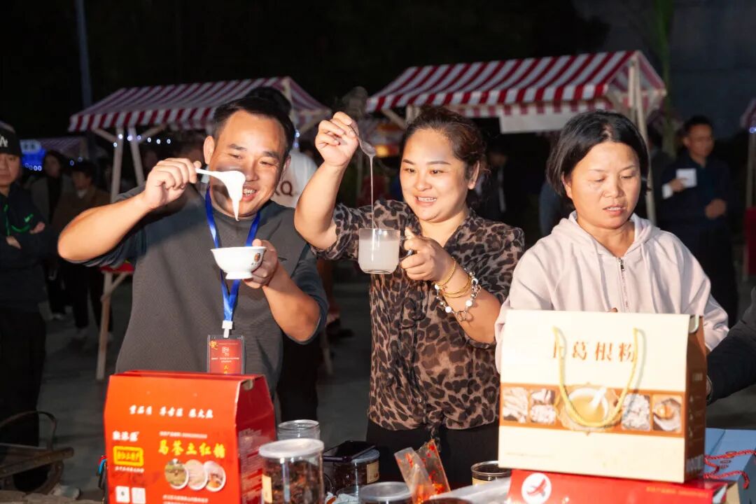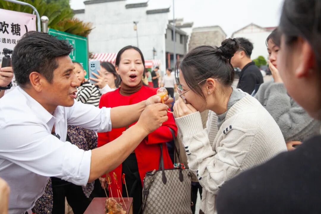 一旁的“行进式烟火集市”同样热闹非凡,从韬奋小镇银杏广场开始,沿途摊位展售的潢溪古法红糖、马荃茄子干、平定粉丝、春涛铁皮石斛、贵溪灯芯糕、龙虎山道茶、錾铜雕刻等特色物产依次陈列,琳琅满目。现场同步开启的助农直播,让这场烟火盛宴成为向外界展现地方特色产业蓬勃生机的鲜活窗口。