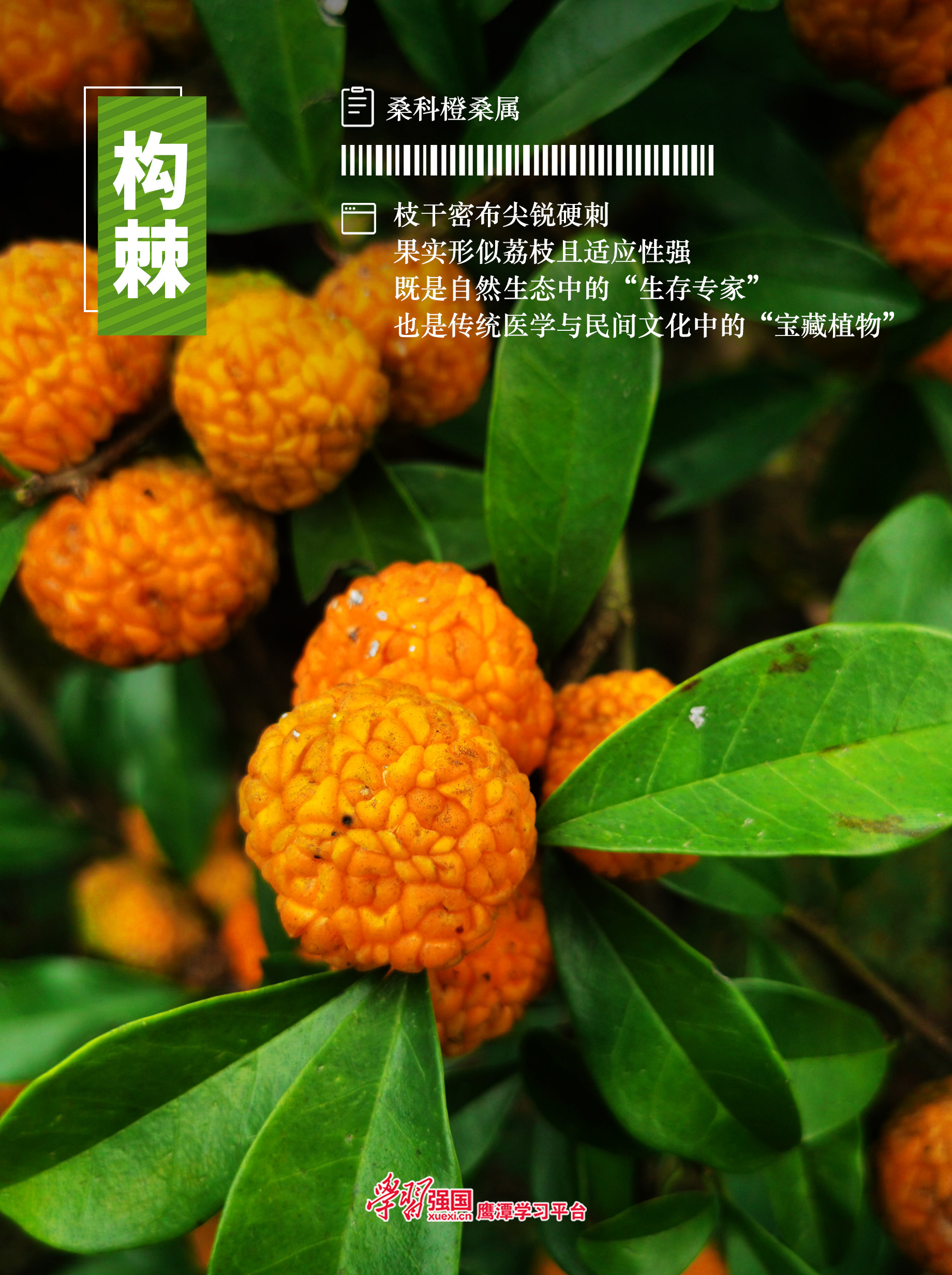 构棘,又称刺柘、山荔枝、老虎刺、穿破石等,是桑科橙桑属的常绿直立或攀援灌木、小乔木,其枝干密布尖锐硬刺、果实形似荔枝且适应性强,既是自然生态中的“生存专家”,也是传统医学与民间文化中的“宝藏植物”。