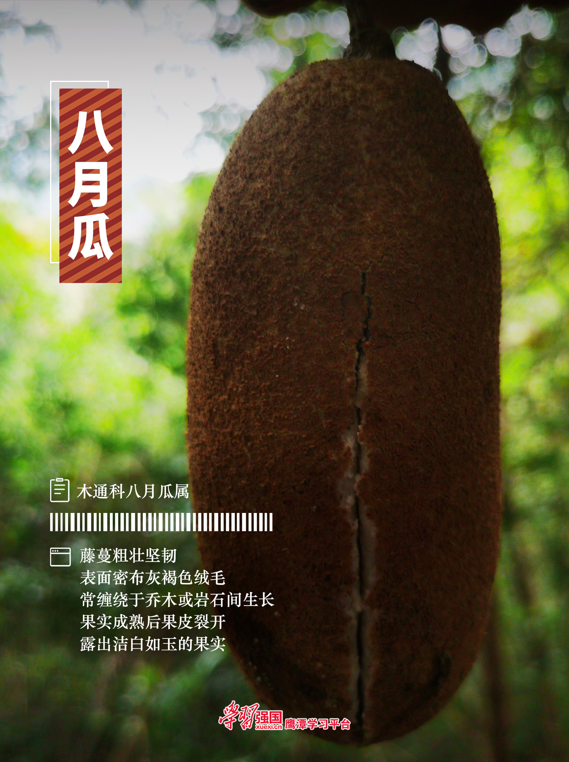 在江西省鹰潭市龙虎山景区上清国家森林公园的密林深处、灌木丛中,常常能见到野生的八月瓜,它外形似香蕉,成熟后果皮裂开,露出洁白如玉的果实,十分诱人。而今,它也走出了深山,被搬进了农家的田间地头,成了农民兄弟的“致富果”。