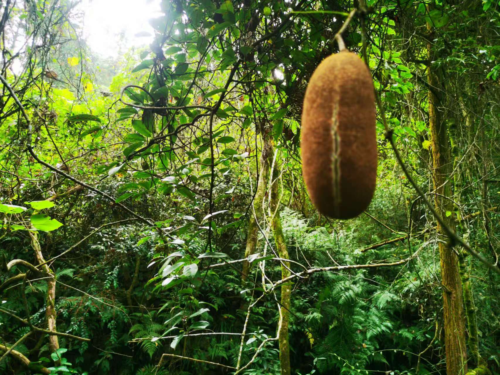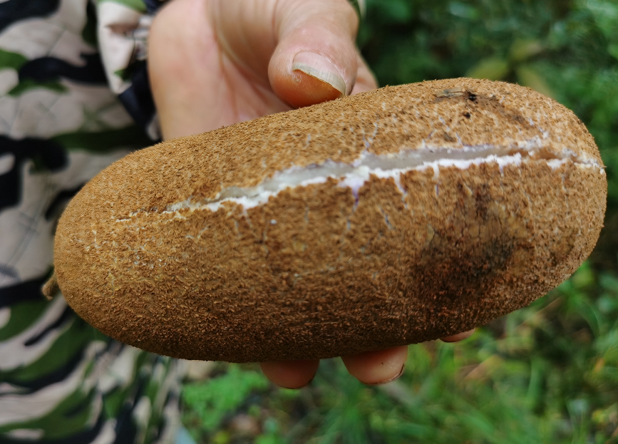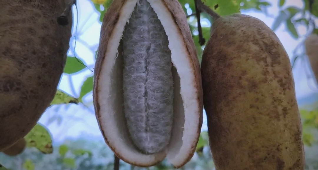 八月瓜,又称牛腰子果、八月炸、通草果等,隶属于木通科八月瓜属,是一种多年生常绿木质藤本植物。藤蔓粗壮坚韧,表面密布灰褐色绒毛,常缠绕于乔木或岩石间生长。叶片为掌状复叶,小叶呈卵形或披针形,边缘有细锯齿,春季新叶嫩绿,秋季转为深绿带红晕。 说到八月瓜,不得不说它的果实,成熟时果皮由青绿色逐渐转为黄褐色,表皮张力达到临界点后,“啪”的一声自然炸裂,露出内部雪白或淡黄色的果肉,籽粒晶莹剔透,形似剥开的香蕉,因此也叫“野香蕉”。果肉富含汁液,既有软糯的绵密感,又带着清冽的甘甜,种子占比约30%,但可随果肉一同食用。