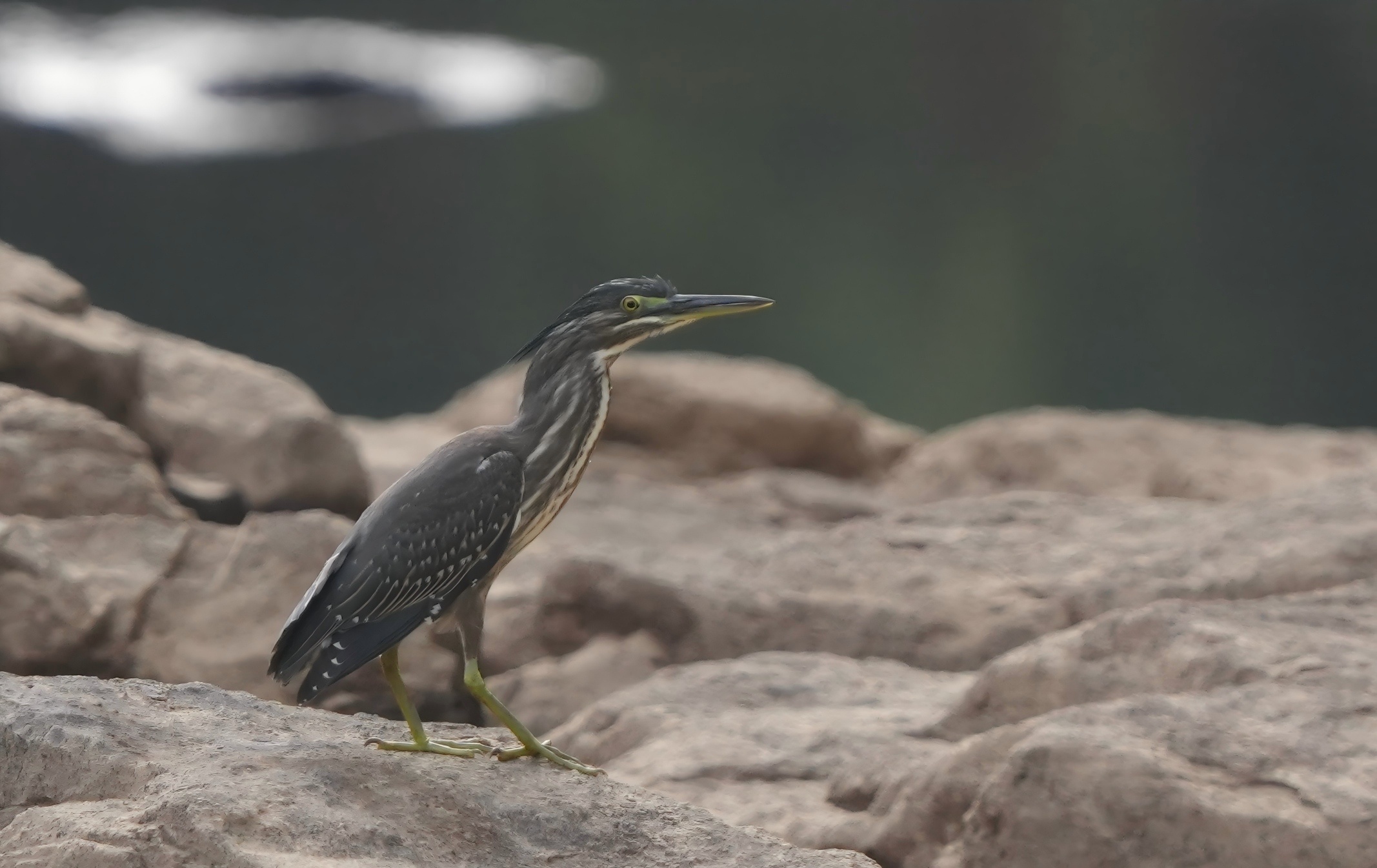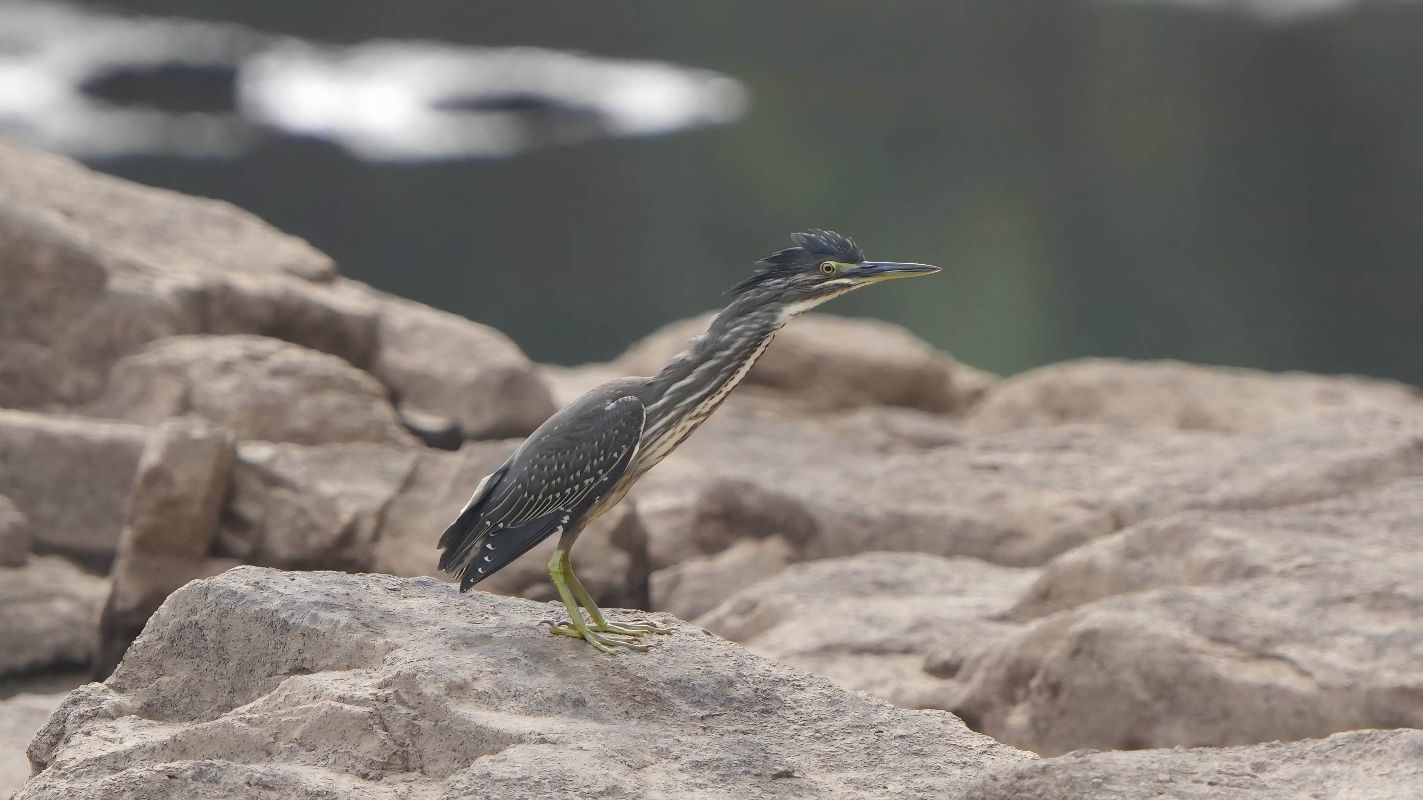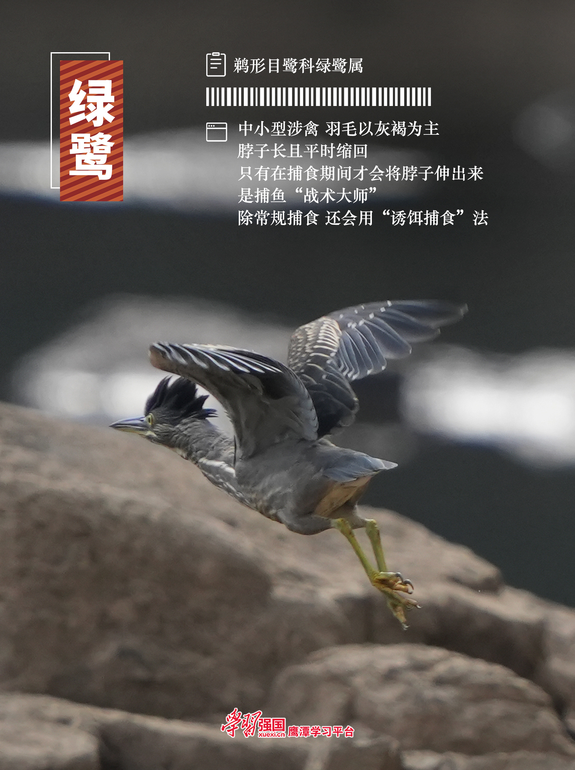 绿鹭是鹭科家族中体型较为轻巧的成员,尽管名字中带有“绿”字,但它的羽毛却以灰、褐为主,仅部分羽缘泛出金属绿光泽。头部、颈部至背部覆盖着灰褐色至橄榄绿色的羽毛,羽缘点缀细密的白色或浅黄色斑点,形成类似“碎花”的伪装效果。腹部则为灰白色或浅灰色,与上部形成柔和过渡。成鸟头顶有一簇竖直的黑色羽毛,像一顶小巧的“冠状帽”。眼周皮肤呈亮黄色,虹膜为黄色或黄绿色,与暗色羽毛形成对比,增强了视觉敏锐度;喙细长而尖锐,基部黄色,尖端黑色,适合精准刺穿猎物;腿和脚为黄绿色,趾间有半蹼,便于在浅水或泥沼中灵活行走。幼鸟全身羽毛则以灰褐色为主,密布粗重的深色纵纹,起到躲避天敌的作用。 绿鹭是典型的肉食性鸟类,食谱以小型水生动物为主,包括小鱼、蛙类、水生昆虫、甲壳类以及小型爬行动物,也有捕食雏鸟或小型啮齿类的绿鹭。与其他鹭科鸟类不同,绿鹭堪称捕鱼“战术大师”,俗称“打渔郎”。它们眼神锐利耐心极佳,时常一动不动站在水边等待过往的鱼虾,一旦猎物游过,就会迅速出击,偶尔也会挥翅一头扎进水中捕食,绿鹭捕食成功率非常高。这些捕食方式都只能算是基本功,更绝的是“诱饵捕食”,即主动从水中或岸边捡起昆虫、浆果、面包屑等,故意丢在水面吸引贪吃的鱼群聚集,随后趁机发动攻击,若游过来的猎物体形过大,绿鹭还会把诱饵收回,等待时机再次抛出,直至小鱼上钩。
