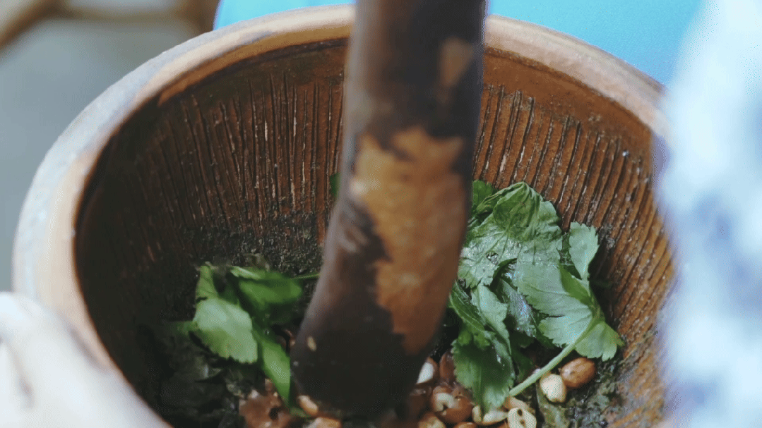 逛完围屋别闲着 来解锁隐藏体验 ——手打客家擂茶 将准备好的茶叶、花生 芝麻、黄豆、大米等料 放入特制的擂钵中 用陶土烧制的擂钵 反复擂磨成细腻的糊状 滚烫的开水顺着钵沿缓缓注入 既有茶叶的清香 又有花生、芝麻等原料的 醇厚香味
