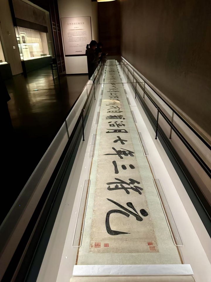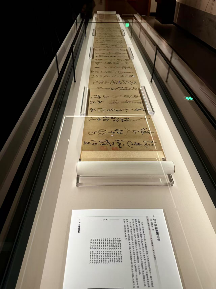 行书青衣江题名卷。澎湃新闻记者 郑问 摄 行书青衣江题名卷,此作写于黄庭坚五十六岁,代表了黄庭坚晚年书法的高超水平。黄庭坚于大字可谓情有独钟,此作一列一字,却以笔势牵连形成整体,气韵贯通,浑然天成。下笔爽利,收笔沉稳,气象奇伟,尽显“大字无过《瘗鹤铭》”的古雅气度。此作为黄庭坚现存墨迹中字最大的一件书法作品,卷长10米在整个宋代文人书法中亦罕见。 特展策展人、江西省博物馆副研究员刘迪在接受包括澎湃新闻在内的媒体采访时表示,此次展览中有三件黄庭坚的真迹,“黄庭坚墨迹现在存世的可能有40余件,在大陆地区的可能不足20件,此次特展能借到3件(展陈)也是十分不容易的。” “这次展览的特色是我们希望用黄庭坚的直接相关展品来呈现他的人生轨迹和艺术成就。其中有30多件是跟黄庭坚直接相关的展品。除此以外,我们也想呈现整个宋代文化的风貌,所以也会呈现一些像瓷器、古琴这类可以体现宋代雅韵的器物,以及和黄庭坚相关的朋友圈、书法家等等。”刘迪继续介绍,此外,展览中还设置了听诗、闻香等互动设备,能够让观众沉浸式体验黄庭坚的翰墨诗心。 他还表示,此次特展是第一个系统呈现黄庭坚生平和艺术成就的原创展览,也是中国大陆地区一次性展出黄庭坚墨迹最多、书体最全的展览。