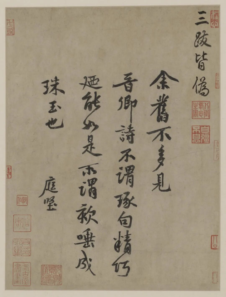 行楷书跋王诜自书诗词页。图/“江西省博物馆”微信公众号 行楷书跋王诜自书诗词页,此作为不可多得的黄庭坚早期行楷书墨迹。元祐年间,黄庭坚与王诜往来频繁,王诜屡邀黄庭坚至其宅园听笛、赏景、品鉴书画、唱和酬咏,情谊深厚。元祐元年(1086),黄庭坚与苏轼皆曾为王诜自书诗词卷作跋,字里行间透露出对王诜诗情的由衷钦佩。