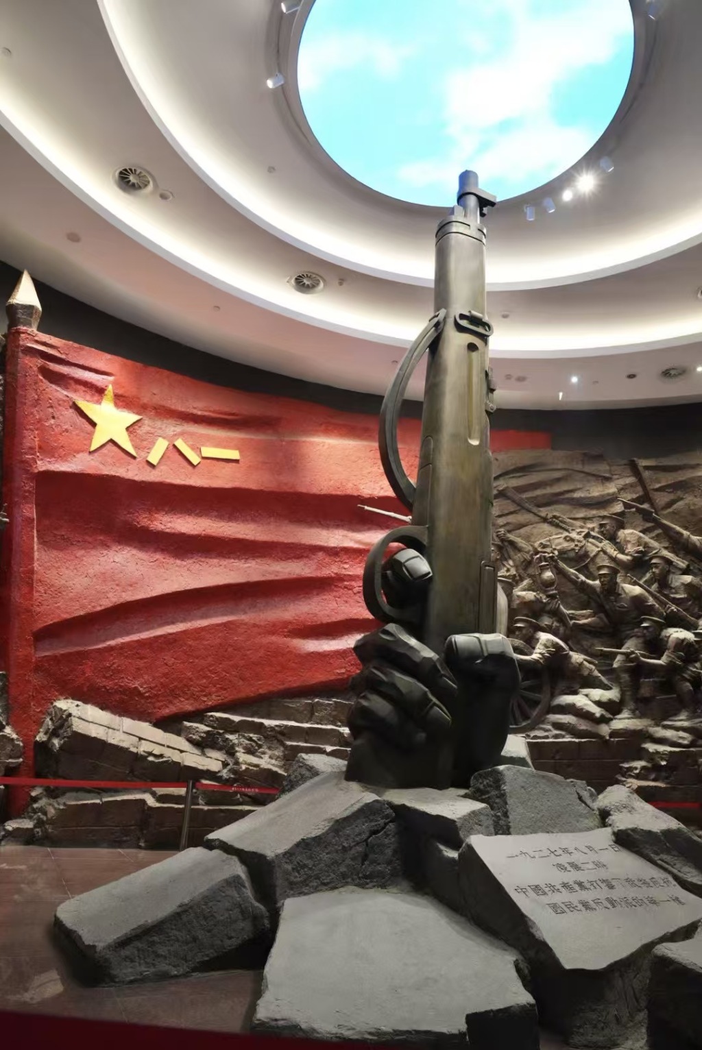 南昌八一起义纪念馆里的雕塑。澎湃新闻记者 王洛伊 图 “英雄城”的称呼,来源于一篇文章。1952年,首任南昌市市长邓飞在当时的中共中央中南局机关报《长江日报》上发表了一篇名为《南昌,英雄的城市》的文章,首次提出举行过震惊中外的八一武装起义的南昌,是一座英雄的城市。 “那时也是新中国第一个五年计划,《长江日报》编辑向邓飞市长约稿目的也很明确,就是想让他说说5年目标是什么,而当时南昌工业技术很落后,人口也只有30多万,并没什么基础,但要有一股精神和梦想,所以他用南昌起义走出来的第一支人民军队的精神,来响应新中国的南昌建设。”2022年,时任南昌八一起义纪念馆馆长王小玲对澎湃新闻如是说道。 98年光阴流转,南昌在时代进程中稳步前行。“英雄城”也早已成为公众认知中与南昌深度绑定的标识。如此“厚重”的定位,并未让城市的叙事困于呆板或严肃,而是在以轻盈的姿态,浸润到城市的日常表达之中。 正如,每月一次在八一广场举行的升旗仪式,已成为年轻人追捧的爱国主题打卡方式。许多人凌晨便前来排队,只为能更近距离感受国旗升起的庄重时刻。 早在2023年,南昌先后举办了5场升旗仪式,反响热烈。许多网友通过各平台留言,希望南昌能多举办升旗仪式。对此,南昌市委、市政府高度重视,决定从2024年开始改为每月第一天升国旗,使之成为一项持续性的城市仪式。