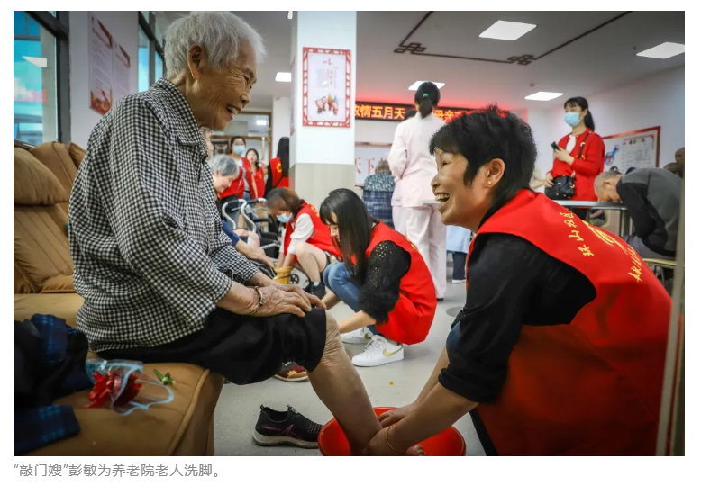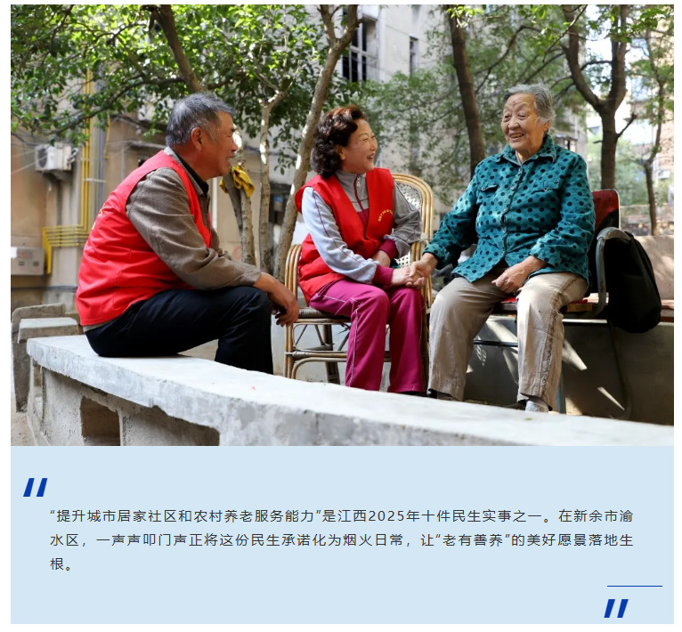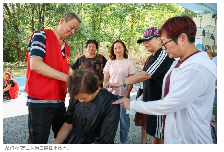 二 温情蔓延 在含笑社区“敲门嫂”的带动下,这份敬老爱老的温情迅速蔓延,渝水区多个社区纷纷组建起自己的“敲门嫂”志愿服务队。 公园北村社区党委书记、居委会主任刘雨婷表示,为了让服务更精准,社区将“敲门嫂”服务队与“银发志愿服务队”“网格员服务队”和社区红十字志愿服务队等队伍进行了整合,组建了一支492人的全新志愿服务队,“不同队伍各有特长,能满足老人的多样化需求。” 年过七旬的退役老兵高吉林,就是队伍里的“特殊人才”。在部队时,他学过基础的针灸和推拿技术,退休后又潜心钻研,成了社区里的“免费医生”。他每年都会自费购买艾草、生姜等药材,亲手加工制作,以备邻居不时之需。 “钱财无关紧要,能治愈人们的病痛、减轻他们的痛苦,才是我真正的快乐。”高吉林说。这些年,他的“敲门服务”从未间断,累计为社区居民无偿治疗上千次。凭着军人的担当和医者的仁心,他成了社区里最受欢迎的“健康守护者”。 随着队伍不断壮大,“敲门嫂”的服务范围也从最初的代买物资、唠家常,扩展到清洁卫生、免费理发、代缴水电费、家电维修等20余项。截至目前,渝水区已有58支“敲门嫂”队伍,志愿者超1.1万名,常年服务着城区8000余名有需求的老人、儿童及残疾人群体,开展活动超1.2万场次。 为了让服务更便捷高效,渝水区还不断创新服务模式。在新钢街道,“敲门嫂”小程序正式上线,老人只需在手机上“点单”,社区文明实践所站就会“派单”,志愿者随后“接单”,全程闭环管理。“有次我家热水器坏了,用小程序一点,不到半小时‘敲门嫂’就来了,很快就修好了。”王大爷说起这事,满脸赞许。