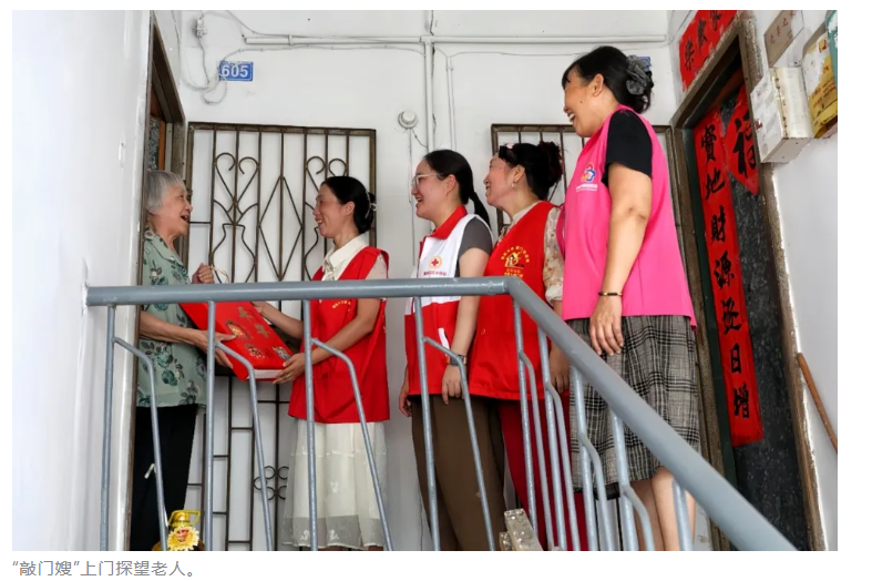 一 初心叩门 初冬时节,含笑社区老旧楼房的楼道里,阳光透过斑驳的窗棂,在台阶上投下细碎的光影。“杨大姐,家里还有菜吗?”“敲门嫂”黄炳荣看到97岁的独居老人杨馥桂,亲切地打着招呼,“特意来问问,家里还缺啥油盐酱醋,或是想吃点啥新鲜的?” 杨馥桂一眼就认出了黄炳荣,浑浊的眼睛瞬间亮了起来,连忙伸出手紧紧拉住黄炳荣的手腕:“炳荣啊,快进来快进来!都有呢,前两天闺女回来给我送了好些菜,够吃好几天啦!” 面对记者,杨馥桂打开了话匣子,语气里满是感激:“我这腿脚不利索,子女又忙工作,平时想买点小东西都难。多亏了炳荣,每次路过都来问问我,油盐酱醋、蔬菜水果,他都帮我买回来,从不嫌麻烦。”老人顿了顿,压低声音补充道:“他还总惦记着我,家里炒了小菜就端一碗来,尤其是他做的红烧肉,炖得烂烂的,我牙口不好也能吃,还有那豆腐,嫩得很,比我自己做的好吃多啦!” 谈及最初的相遇,黄炳荣回忆道:“刚开始我们上门的时候,老人们大多都挺谨慎的,有的隔着门应一声,有的干脆装作没人在家。”但他没气馁,每周雷打不动地上门探望,日子久了,老人们心里的隔阂也慢慢被融化了。“现在啊,我们一敲门,老人们都乐呵呵地开门迎接,把我们当亲人一样。”黄炳荣笑着说,这份信任与认可,成了他们坚持下去的最大动力。 含笑社区成立于1991年,是典型的老旧社区,60岁以上老人占比超六成,空巢独居老人的生活与健康状况令人担忧。“早在2013年,含笑社区就以解决群众的实际问题为出发点,组织热心的志愿者定期探访空巢和独居老人,帮助他们购买食材、做饭、打扫卫生、洗衣晒被等。”含笑社区党委书记罗娟介绍,正是在这样的背景下,一支由居委会主导,汇集了老党员、老干部、老职工、楼栋长以及热心居民的“敲门嫂”文明实践志愿服务队应运而生。 值得一提的是,“敲门嫂”的称呼不限性别,他们带着同样的热心,把冷清的楼道、独居的家门,焐出了浓浓的人情味。