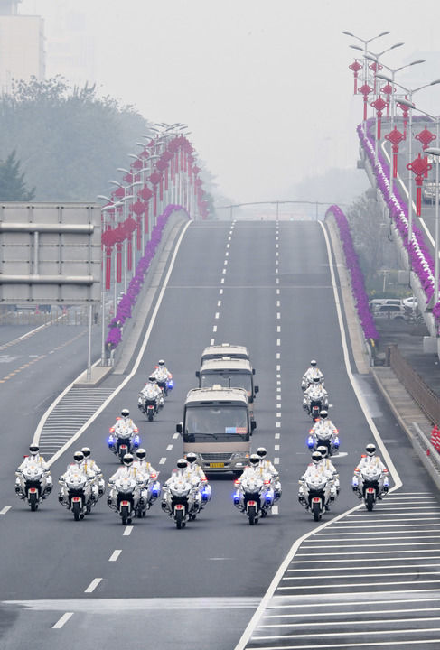 2024年9月29日,中华人民共和国国家勋章和国家荣誉称号颁授仪式在北京人民大会堂隆重举行。这是国家勋章和国家荣誉称号获得者集体乘坐礼宾车,由国宾护卫队护卫前往人民大会堂。新华社记者 高洁 摄 会场外,鲜艳的红毯从大会堂东门铺下,肩枪礼兵庄严伫立,朝气蓬勃的少年挥动出红旗的海浪。 会场内,两名旗手高擎五星红旗,三名礼兵手捧共和国勋章、友谊勋章和国家荣誉称号奖章,步履雄健,气势如虹。