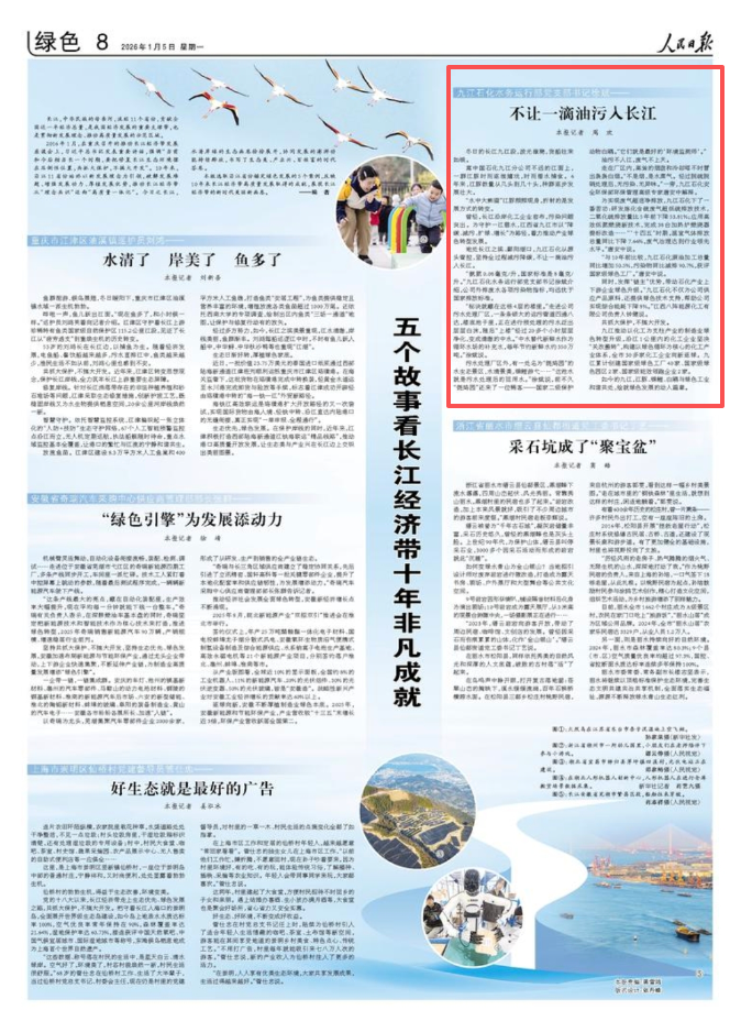 1月5日,人民日报推出整版报道《五个故事看长江经济带十年非凡成就》,其中以《不让一滴油污入长江》为题,报道为守护一江碧水,江西省九江市以“降碳、减污、扩绿、增长”为路径,着力推动产业绿色转型发展。尤其是九江石化从源头管控,坚持全过程减污降碳,不让一滴油污入长江。