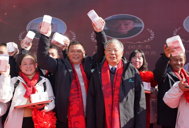 这是1月9日拍摄的位于江西省南昌市安义县的奖金发放现场。新华社记者 周密 摄 1月9日上午,江西南昌市安义县鼎湖镇的一个大院里,成捆百元钞票堆成一座齐整的“钱山”,这是当地种粮大户老凌连续第15年给农民发年终奖。 “跟着老凌种田8年,奖金越拿越多。”54岁的“年度冠军”刘平香笑得合不拢嘴。 老凌名叫凌继河,今年65岁。2025年他流转种植8万多亩农田,粮食产量达1.27亿斤。 从2012年的98万元增长到今年的2129万元,他坚持每年给农民发放年终奖,多年来累计给农民发年终奖9099万元。