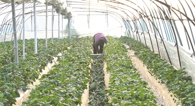 农户在去除草莓多余的枝条。
