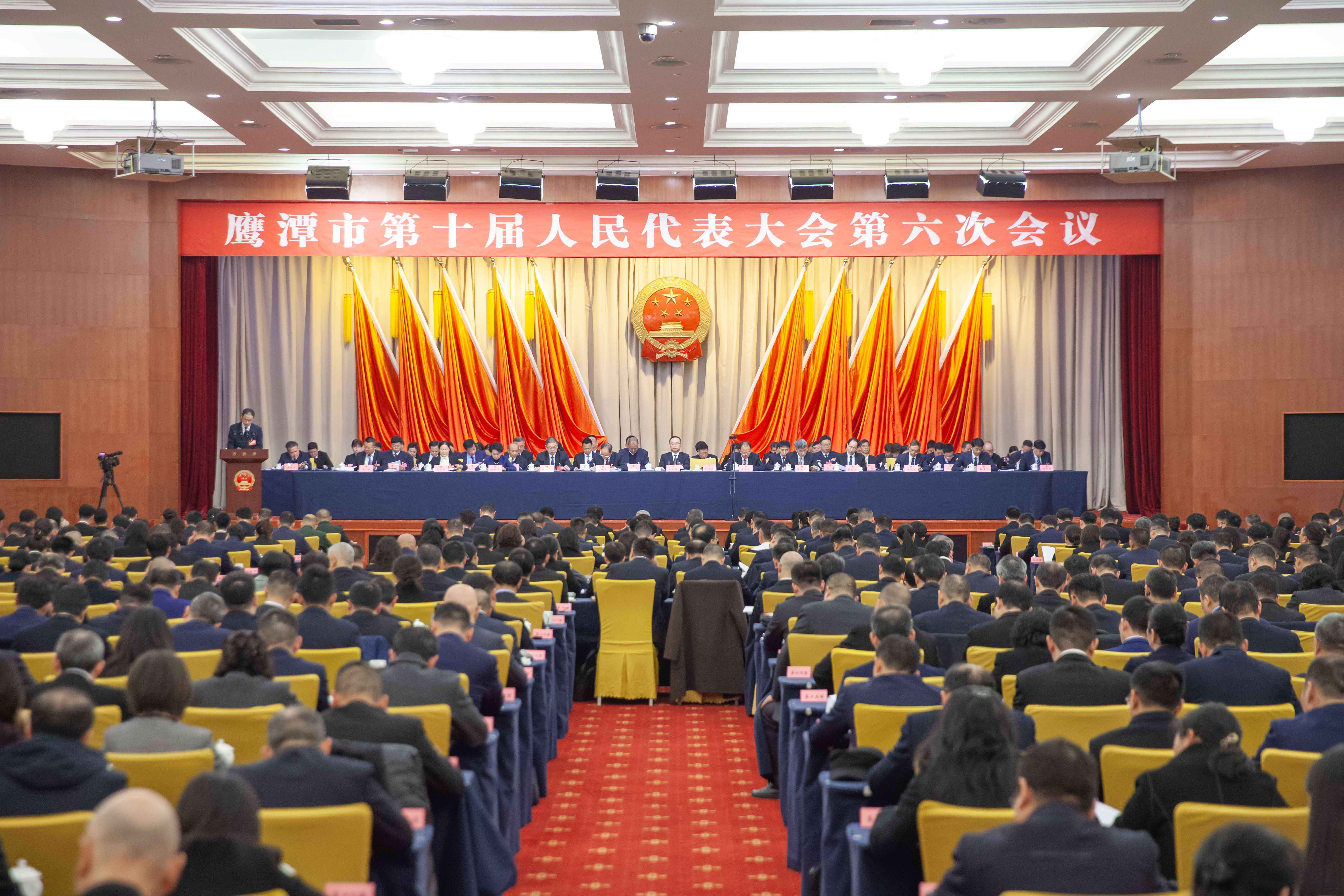 2月4日上午,市十届人大六次会议开幕。 黄苏明 摄 2月4日上午,鹰潭市第十届人民代表大会第六次会议在华侨饭店会议中心开幕。来自全市各地各条战线的市人大代表肩负着全市人民的重托,以饱满的政治热情出席大会,履行宪法和法律赋予的神圣职责,共商鹰潭未来发展大计。 大会会场简朴而庄严,主席台帷幕正中的国徽在红旗映衬下熠熠生辉,现场气氛庄重而热烈。 本次大会应到代表261名,实到245名,符合法定人数。 大会执行主席王亚联、黄金龙、肖国军、吴建辉、夏涌波、雷纪文、程美华、徐双文、李美珍、赵勇凯、陈敏在主席台前排就座。 在主席台就座的有:王亚青、黄云、蔡江、黄忠、褚小涛、江训开、陈鹏、杜德春、郭清、汪永华、万玲、胡春平、刘江、王有金、张金涛、聂玲娜、刘军生、席志新、舒忠东、张愈、龚雪林、张江、周谷昌、肖霖、李力、周永江、胡高堂、刘育虹、黄知慧、罗喜仔和大会主席团其他成员。 大会由黄金龙主持。上午9时,黄金龙宣布大会开幕,全体起立,雄壮嘹亮的国歌声在大厅内回荡。 在热烈的掌声中,王亚青代表市人民政府向大会作政府工作报告。报告分三部分:2025年及“十四五”时期发展回顾、“十五五”时期发展的主要考虑、2026年工作安排。 王亚青说,2025年是“十四五”规划收官之年,也是鹰潭在高质量发展征程上攻坚克难、砥砺奋进的关键一年。在市委的正确领导下,全市上下坚持以习近平新时代中国特色社会主义思想为指导,深入贯彻党的二十大和二十届历次全会精神,认真落实习近平总书记考察江西重要讲话精神,聚焦“走在前、勇争先、善作为”的目标要求,凝心聚力、真抓实干,经济增长稳健向好,产业升级步伐坚实,投资消费协同增效,改革开放走深走实,城乡环境日益焕新,幸福指数稳步攀升,治理能力不断提升,推动高质量发展迈出坚实步伐。全年地区生产总值增长6.2%,规上工业增加值增长11.1%,固定资产投资增长4.4%,社会消费品零售总额增长4.2%,我市连续3年获评全省综合考核第一等次,在服务全省发展大局中,切实扛起了“小市争作贡献”的责任担当。 王亚青说,经过五年的不懈奋斗,“十四五”规划目标总体实现,鹰潭高质量发展的基础更加扎实,在服务全省乃至全国发展大局中展现了新担当、实现了新作为。这五年,是综合实力拔节生长、能级量级持续跃升的五年;是工业经济强势崛起、产业根基愈发牢固的五年;是创新活力持续涌动、驱动效能显著提升的五年;是改革开放纵深推进、发展空间不断拓展的五年;是城乡融合深度推进、人居环境愈发优美的五年;是民生福祉持续增进、人民生活全面改善的五年。这些成绩的取得,根本在于习近平总书记领航掌舵,在于习近平新时代中国特色社会主义思想科学指引,归功于省委、省政府的正确领导和市委的统筹部署,得益于市人大、市政协的依法监督、民主监督,更凝聚着全市人民的智慧汗水与辛勤付出。 王亚青说,市委九届十次全会已对未来五年经济社会发展作出系统谋划和战略部署,市政府据此编制了《鹰潭市国民经济和社会发展第十五个五年规划纲要(草案)》。《纲要(草案)》是未来五年我市发展的行动指南,市政府将以真抓实干的作风、攻坚克难的劲头,凝心聚力抓落实,久久为功求实效,推动目标任务稳步落地,切实把宏伟蓝图转化为鹰潭高质量发展的生动实践和美好现实。 王亚青说,今年是实施“十五五”规划开局之年,开局关系全局。政府工作的总体要求是:以习近平新时代中国特色社会主义思想为指导,深入贯彻党的二十大和二十届历次全会精神以及习近平总书记考察江西重要讲话精神,全面落实中央、省委、市委经济工作会议和省委十五届九次全会、市委九届十次全会精神,完整准确全面贯彻新发展理念,加快构建新发展格局,着力推动高质量发展,坚持稳中求进工作总基调,坚决贯彻“两个更好统筹”,持续扩大内需、优化供给,做优增量、盘活存量,加快打造国家级铜基新材料集群,因地制宜发展新质生产力,主动服务和融入共建全国统一大市场,坚持稳健发展,持续防范化解重点领域风险,着力稳就业、稳企业、稳市场、稳预期,推动经济实现质的有效提升和量的合理增长,保持社会和谐稳定,实现“十五五”良好开局,为全省高质量发展大局贡献更大力量。 王亚青说,今年经济社会发展主要预期目标是:地区生产总值增长5.5%左右,规上工业增加值增长9.5%左右,固定资产投资增长4.5%左右,社会消费品零售总额增长4.5%以上,一般公共预算收入增长1.5%左右,城乡居民人均可支配收入分别增长4.6%、6%左右,居民消费价格涨幅控制在2%以内,主要污染物排放等指标完成省下达目标。 王亚青强调,今年市政府要重点做好八个方面工作:一是赋能科创驱动,打造现代产业新高地。推动产业集群提能升级,提升科技创新整体效能,推进数智化绿色化协同转型,优化产业生态支撑。二是激活内需潜力,夯实经济增长新支撑。精准扩大有效投资,多元提振消费市场。 三是深耕文旅融合,做实“龙虎天下绝”金名片。实施精品提质行动,开展精准营销行动,强化服务保障行动。四是聚力改革开放,释放高质量发展新活力。深化重点领域改革,优化提升营商环境,增创开放与招商优势。五是推进城乡融合,构建协调发展新格局。推动城市内涵式提质,推进乡村全面振
